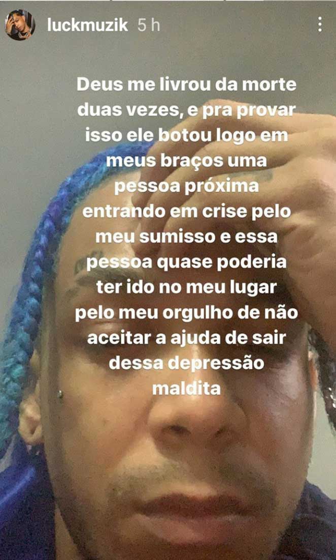 "Gente, me ajudem a achar o Luck Muzik, não sei o que fazer em nome de Jesus. Ele está pelo Rio de Janeiro, acho que pela Barra", escreveu em seus Stories.