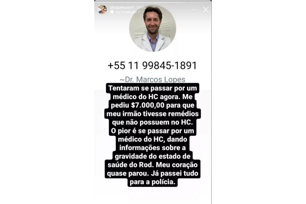 Tentaram se passar por um médico do HC agora. Me pediu R$ 7 mil para que meu irmão tivesse remédios que não possuem no JC”, começou Diogo.