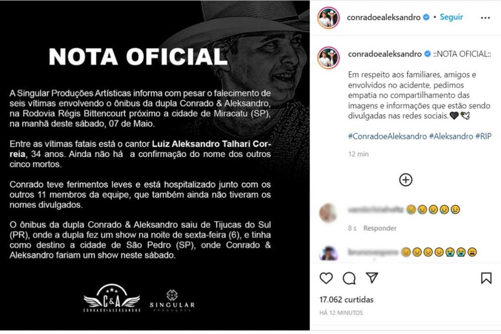 A assessoria da dupla emitiu uma nota oficial na tarde deste sábado, confirmando a fatalidade. A equipe destacou ainda que não se tem a identificação, até o momento, de quem são as outras vítimas fatais e os outros dez feridos que permanecem internados.