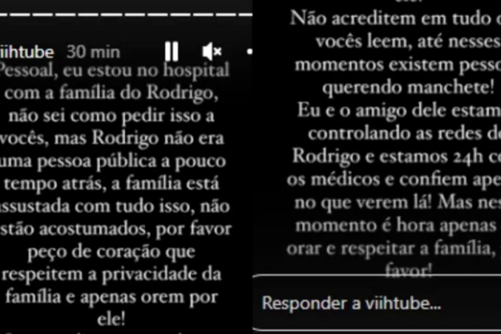 Eu e o amigo dele estamos controlando as redes do Rodrigo e estamos 24h com os médicos e confiem apenas no que verem lá! Mas nesse momento é hora apenas de orar e respeitar a família, por favor!”.