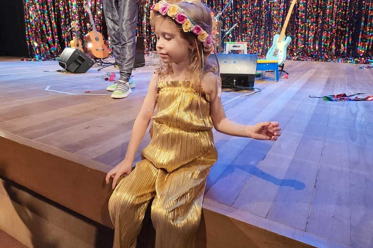 A roupa tanto da atriz quanto da pequena é composta por um vestido completamente dourado que cobre todo o corpo, com sapatilhas da mesma cor e uma coroa de flores completando o look. Duas rainhas, não é mesmo?