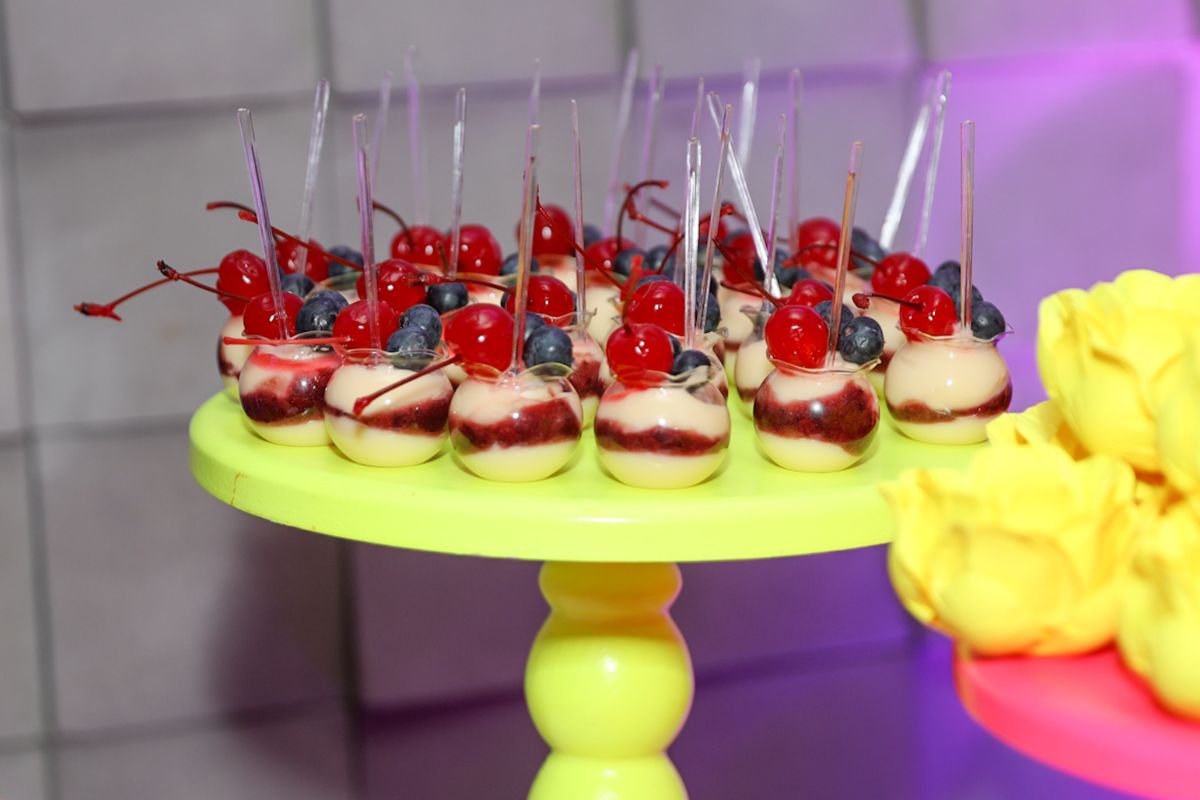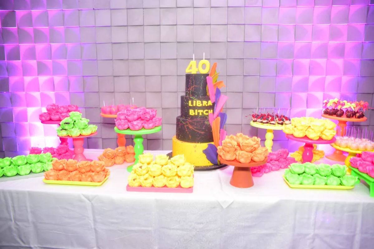 O tema da festa era Neon e, além da decoração e guloseimas de dar água na boca, os convidados também usaram roupas em cores fortes e fluorescentes.