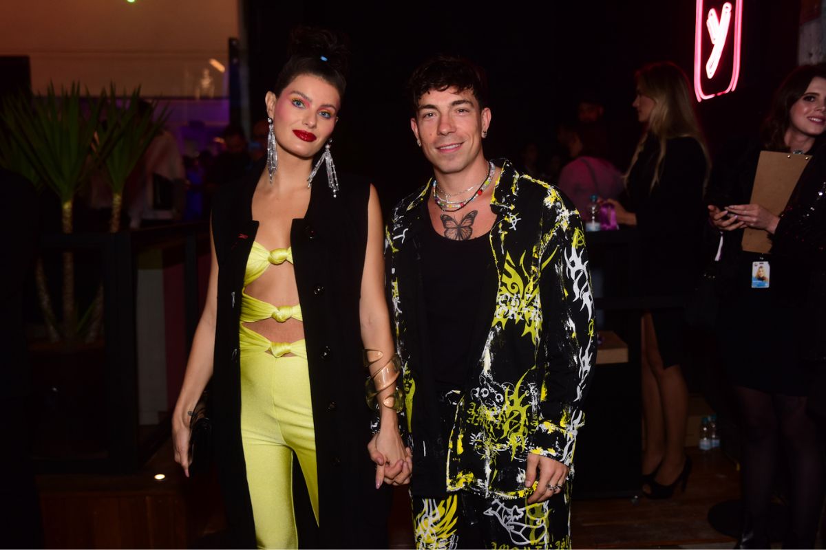 Negra Li com macacão multicolorido e Matheus Mazzafera de preto – Fotos: Andy Santana e Lucas Ramos/Brazil News e Leo Franco/ Agnews