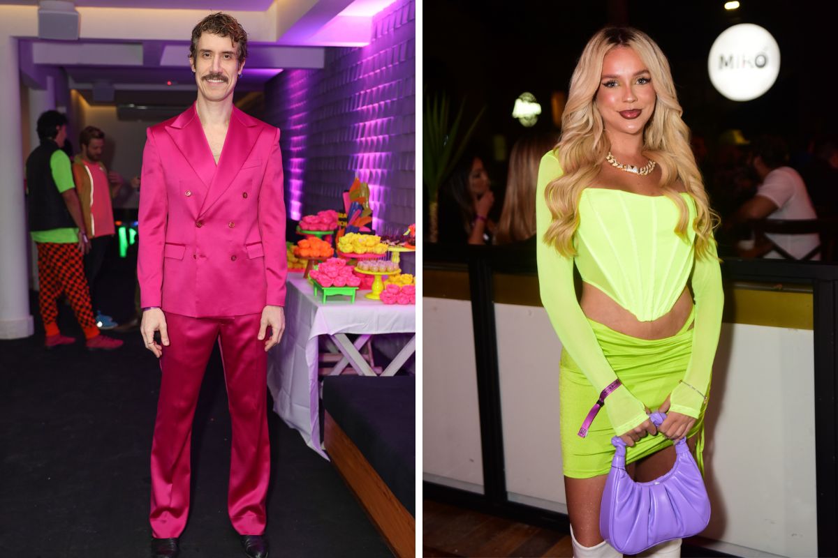 Theodoro Cocrane de rosa-neon e Gabi Lopes de verde-neon – Fotos: Andy Santana e Lucas Ramos/Brazil News e Leo Franco/ Agnews