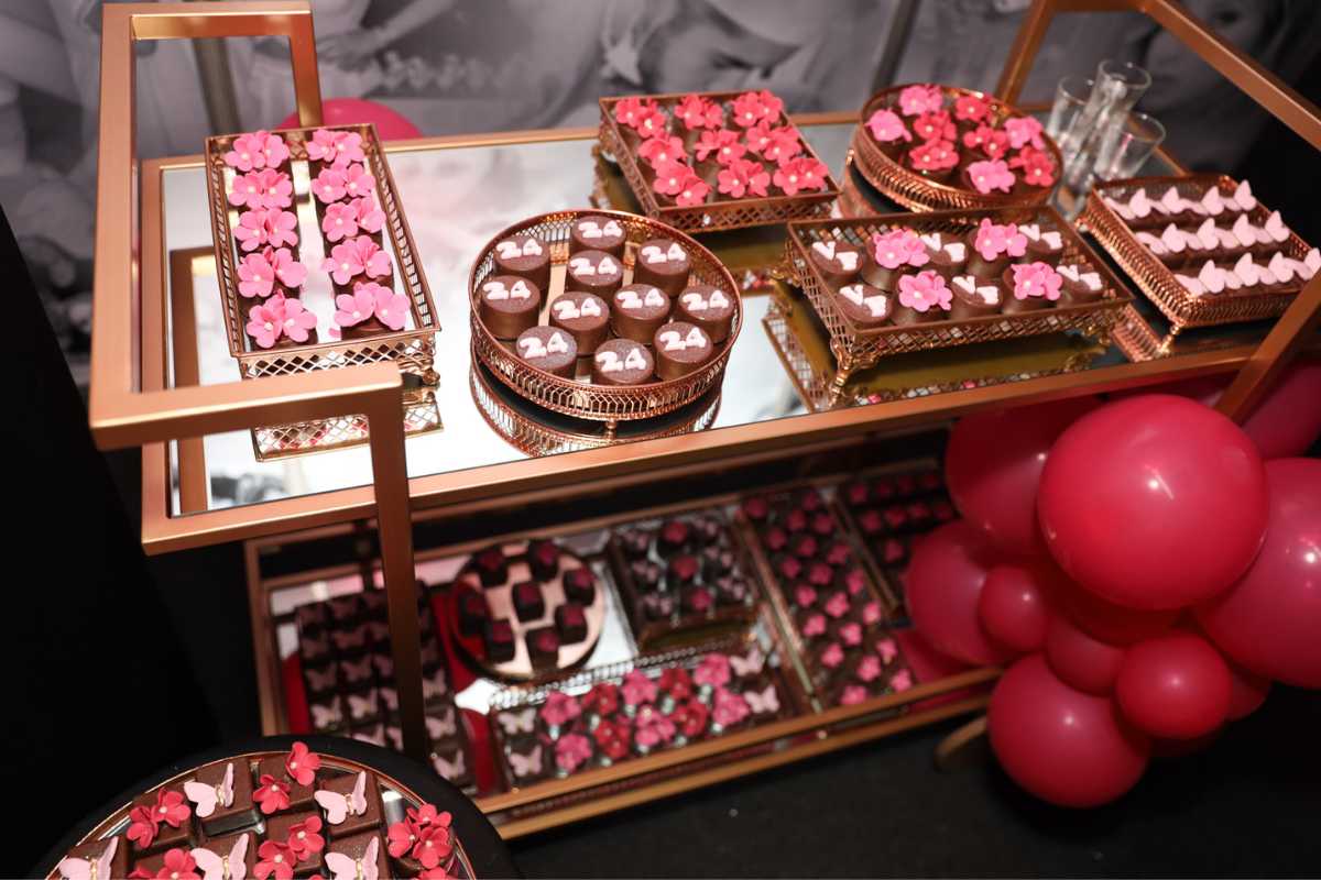 Aliás, a aniversariante chegou a posar com seu grande bolo, todo branco e com as letras iniciais de seu nome, V e F. Ainda, diversos docinhos foram expostos em carrinhos para locomoção. Alguns tinham flores de doce em cima, outros as iniciais e outros o número de 24.