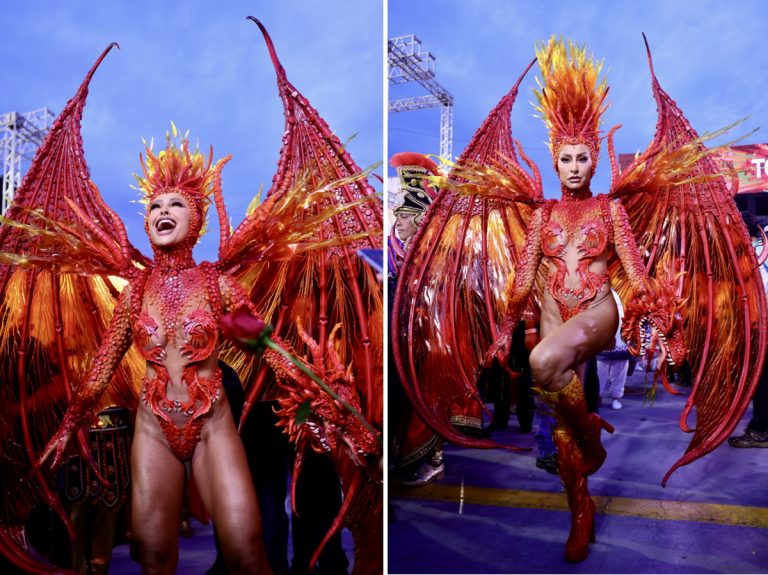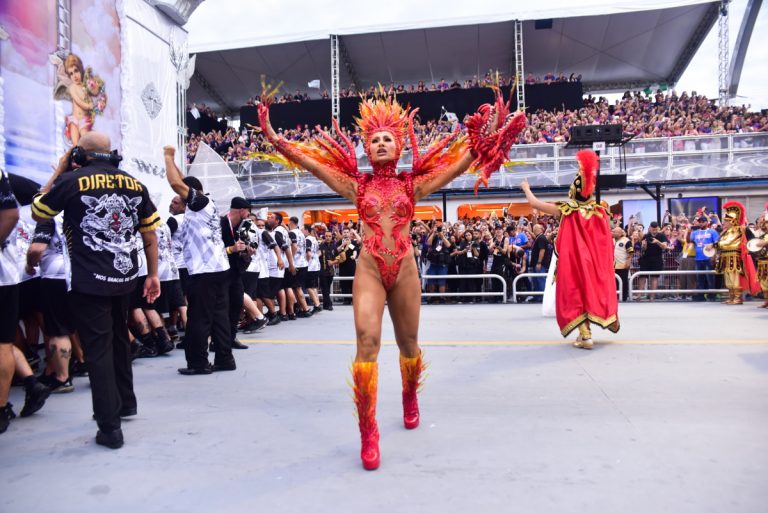 Quase na manhã deste sábado, 18 de fevereiro, a Gaviões da Fiel encerrou o primeiro dia de desfiles do grupo especial de São Paulo. Sabrina Sato, rainha de bateria da escola, usou uma fantasia vermelha simbolizando o Dragão de São Jorge e deixou seu corpão à mostra. A apresentadora mostrou muito samba no pé e brilhou na avenida.