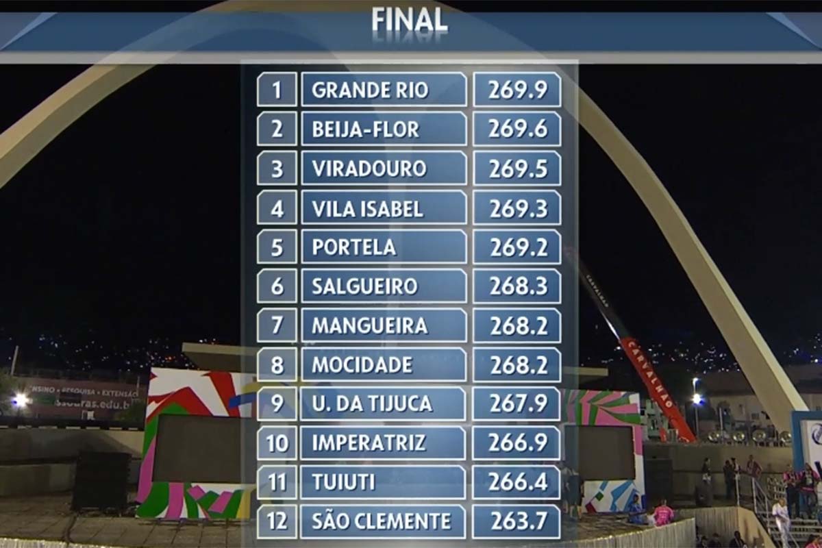 Ao final da apuração, foi declarado que Grande Rio é a grande campeã do Carnaval do Rio de Janeiro. A escola teve um total de 269,9 pontos. Em segundo lugar ficou Beija-Flor de Nilópolis, com 269,6 pontos, e em terceiro Unidos do Viradouro, com 269,5 pontos. Em relação São Clemente, que ficou em último no ranking, com 253,9 pontos, foi rebaixada para a Série Ouro.