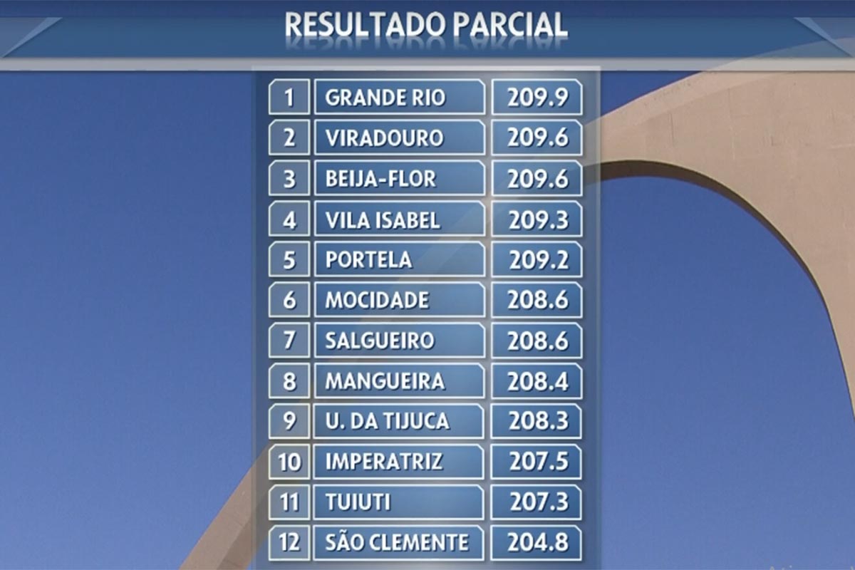 Tal cenário se manteve até o sexto quesito, quando a Grande Rio recebeu notas máximas e foi para primeiro lugar, enquanto a Beija-Flor recebeu diversos números quebrados, caindo para terceiro lugar e sendo passada pela Viradouro, que no penúltimo quesito, voltou a ser ultrapassada pela Beija-Flor, deixando tudo ainda mais emocionante.