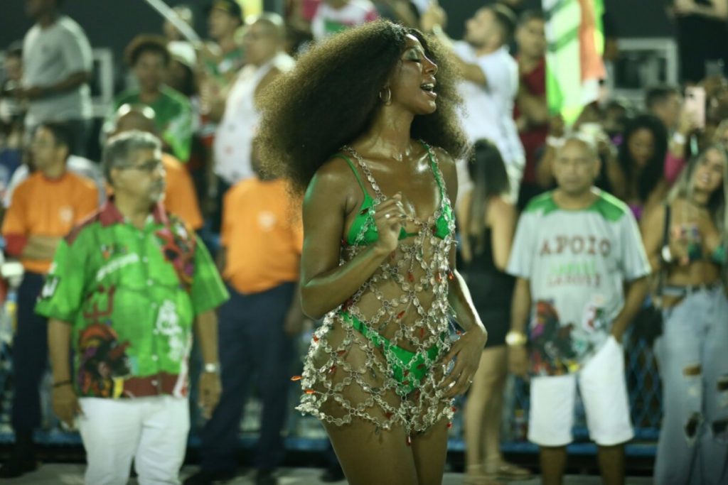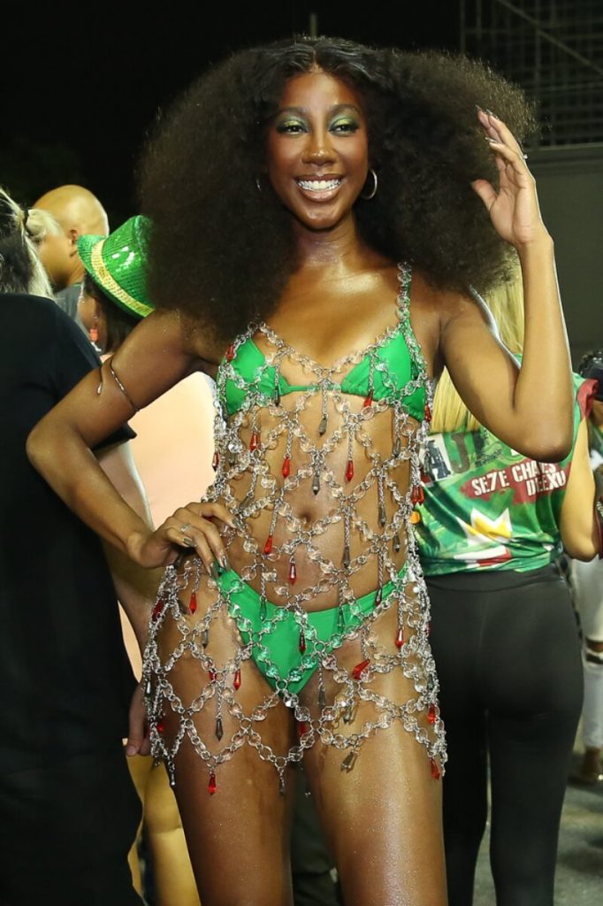 De biquíni verde e um vestido vazado prata, a ex-BBB abriu mão de suas famosas laces e deixou os cabelos naturais soltos. Em suas redes sociais, Camilla celebrou a estreia na Passarela do Samba.