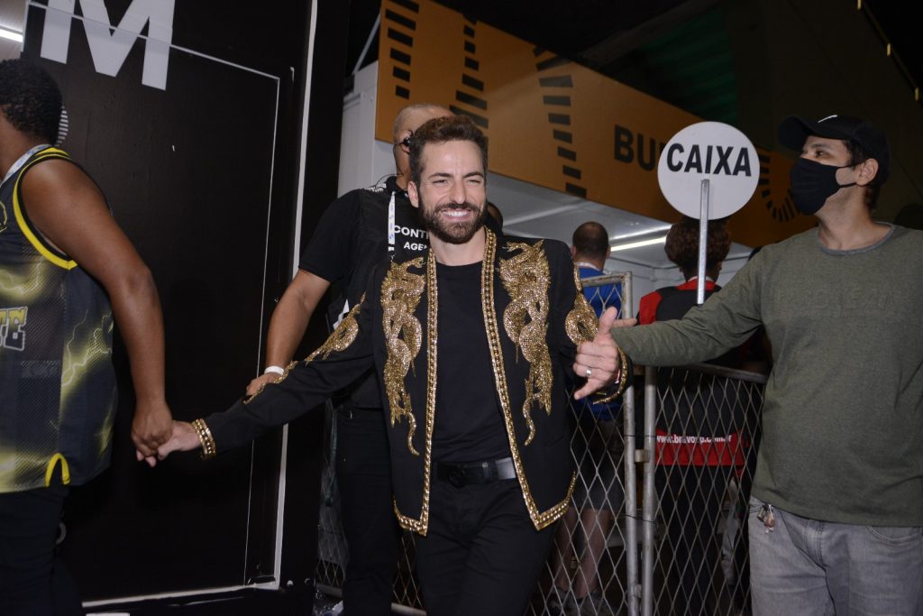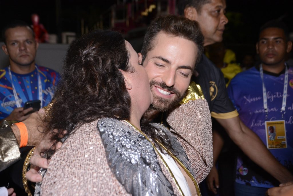 Déa Lúcia, mãe de Paulo Gustavo, acaba de chegar à Marques de Sapucaí. Ela estava acompanhada do genro, o dermatologista Thales Bretas, viúvo do ator, que nesta noite será homenageado pela São Clemente.