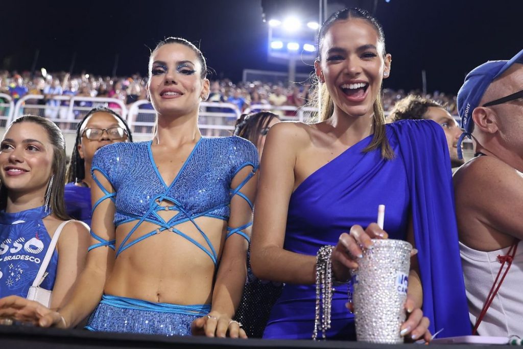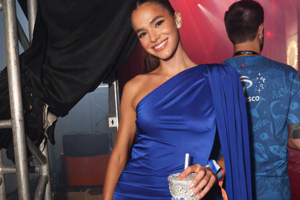 Em relação aos looks, a atriz e modelo novamente fez bonito, apostando em um logo vestido azul escuro, além de uma pulseira brilhante cheia de adereços, assim como o copo levado por ela para a avenida, cheio de bolinhas, mostrando que ela estava curtindo com tudo.