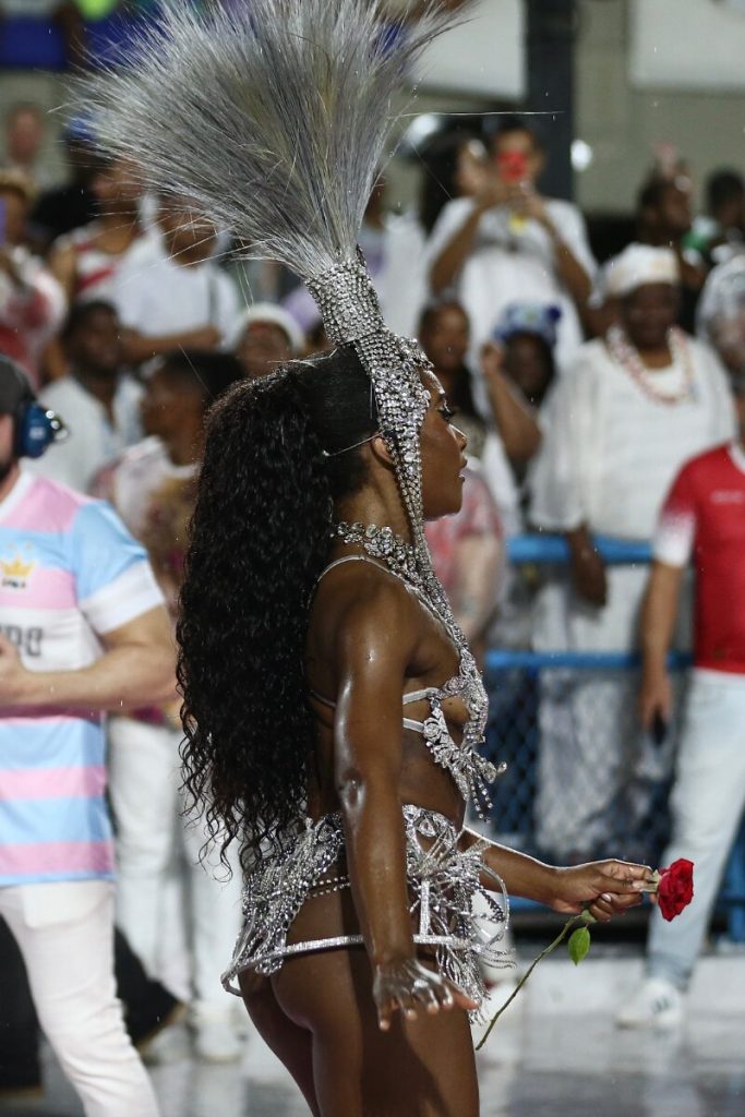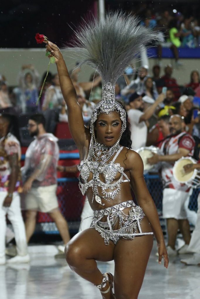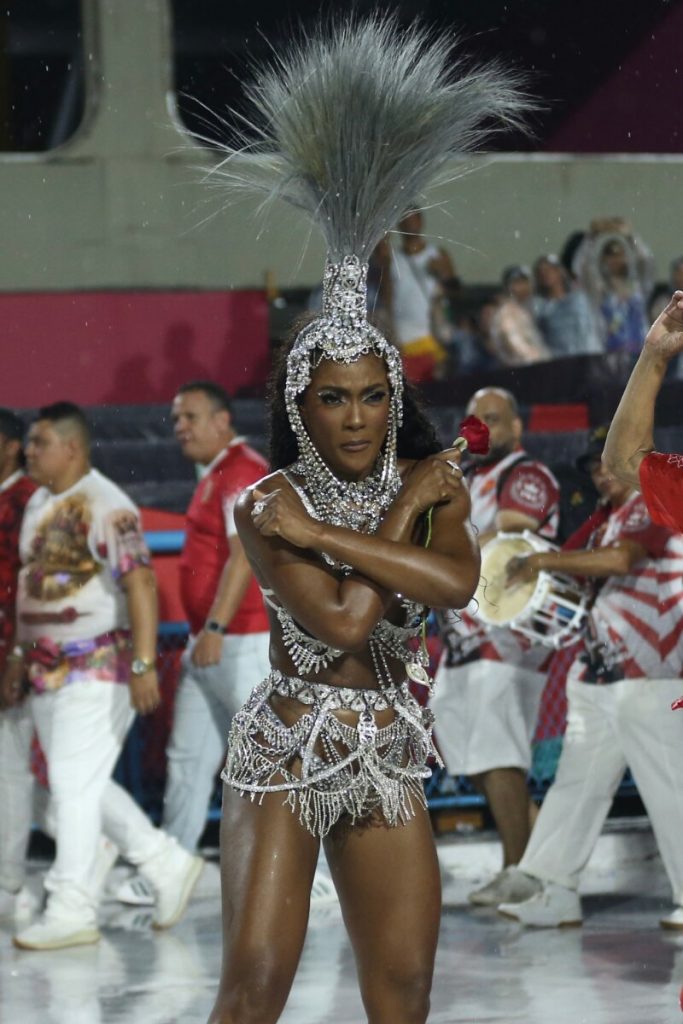 Com a Marquês de Sapucaí literalmente encharcada, a agremiação ensaiou com todo o seu contingente, cheios de garra e com a atriz levantando o público.