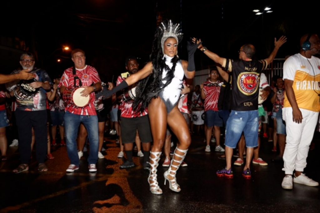 Recriando o enredo “Trevas, Luz, a Explosão do Universo”, que levou a Unidos do Viradouro a um momento mágico na Sapucaí no desfile arrebatador de 1997, Erika Januza ensaiou exuberante em Niterói, na Região Metropolitana do Rio de Janeiro, na noite de domingo, 29 de janeiro, em mais um ensaio da vermelho e branco.