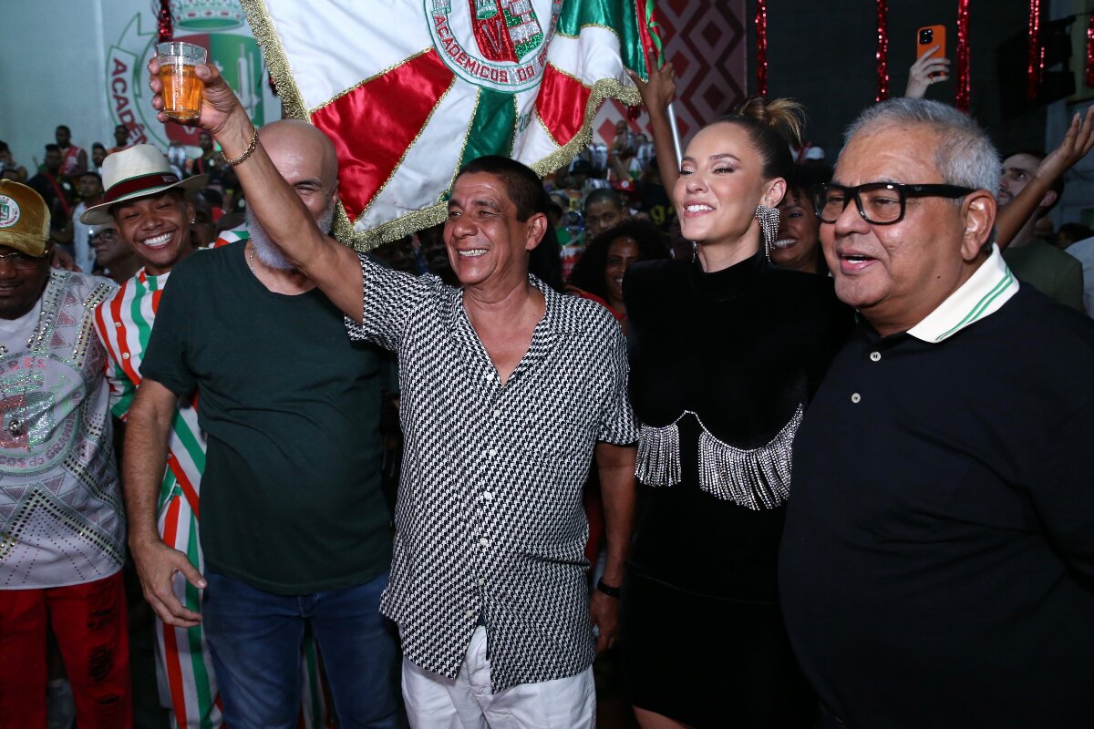 Com seu inseparável copo de cerveja na mão, o cantor recebeu carinho da rainha de bateria, Paolla Oliveira, que estava exuberante num vestido preto.