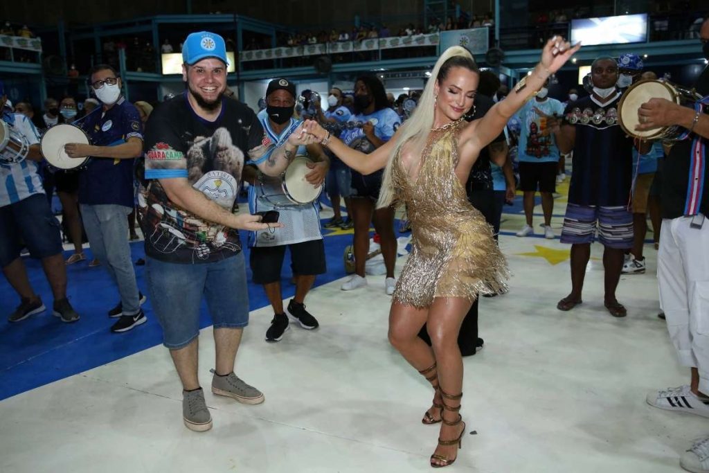 Gabi ainda tocou tamborim, ousou nos passos de samba e posou para fotos com alguns dos membros da escola. Apesar da chegada triunfal, a namorada de Tierry não viu a quadra lotada. Por causa do surto de Covid-19 e de gripe no Rio de Janeiro, a escola precisou limitar o número de convidados do evento.