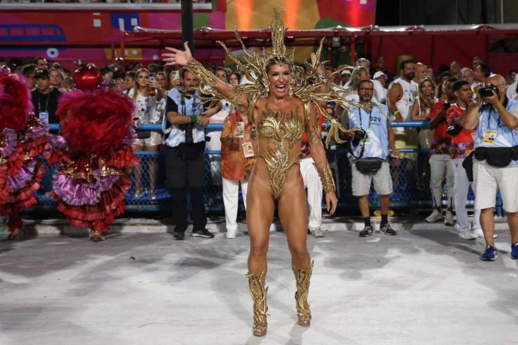 Por fim, Lore estava com uma roupa bem justa e curtinha, toda dourada e lembrando galhos e esperto, inclusive sua coroa. Aliás, no meio do desfile, Improta chocou a todos ao encontrar Paola Oliveira na frisa assistindo, e as duas se cumprimentaram e deram risada de alegria por se verem.