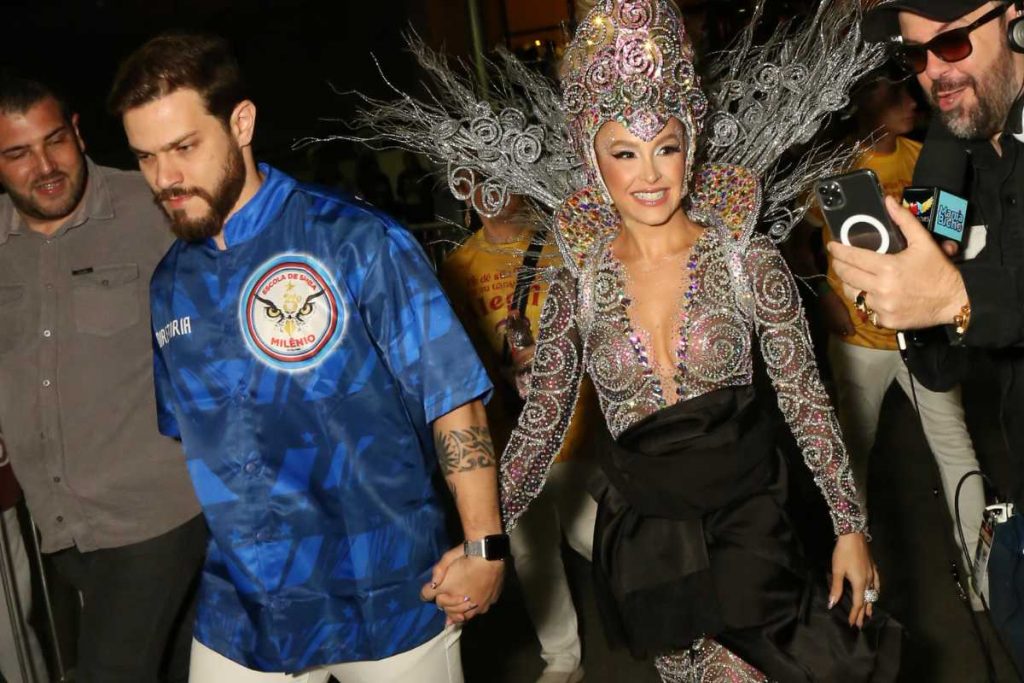 Aliás, a atriz chegou já fantasiada no Sambódromo do Anhembi, usando um look poderoso e brilhante transparente, contendo uma coroa que transmite poder e asas atrás nas costas. Aliás, ela estava acompanhada do noivo, Felipe Becari, que estava vestindo uma camiseta azul.