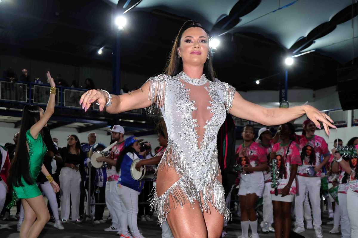 Erika Schneider usou um look cheio de transparências e com 3 mil cristais para a noite da Águias, além de surgir morena na festa da Batucada da Pompéia, que contou com a presença de co-irmãs da escola de samba. Adendo que até a make da modelo tinha cristais.