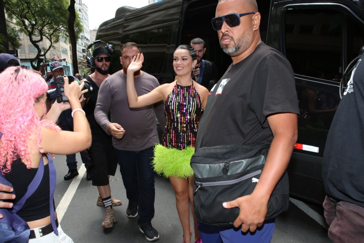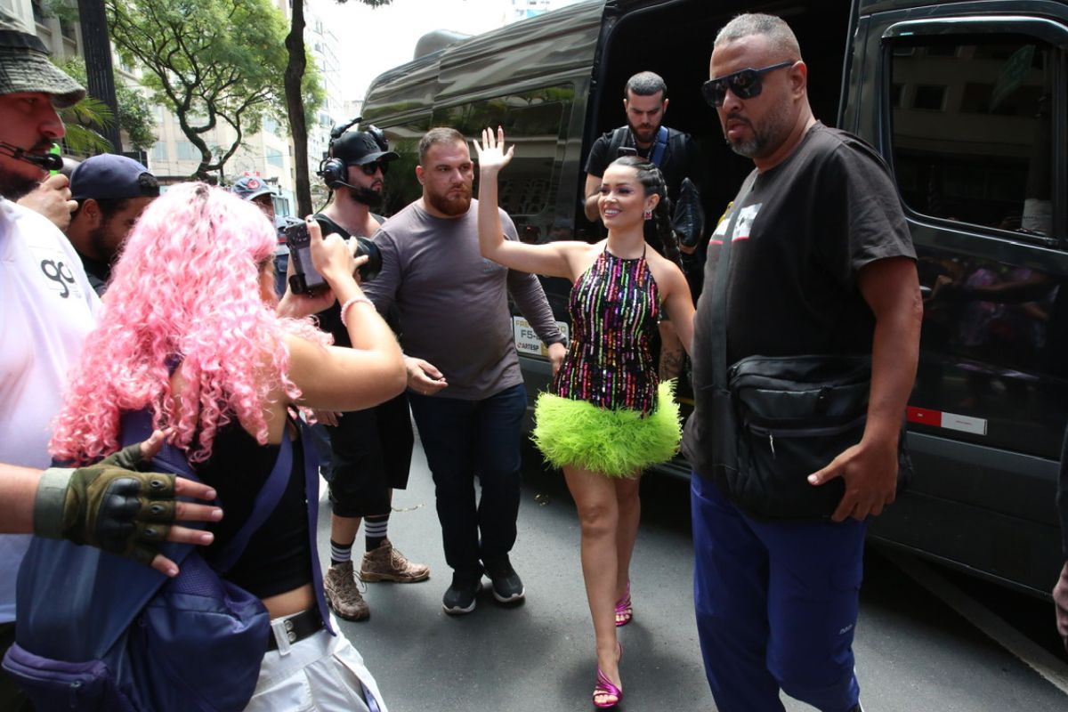 Com um look brilhoso e diferentão, a cantora arrasou no estilo! A parte de baixo do vestido era composta de plumas verdes, e a de cima era preta com detalhes de paetês coloridos. Simpática, ela acenou para o público quando chegou na folia.