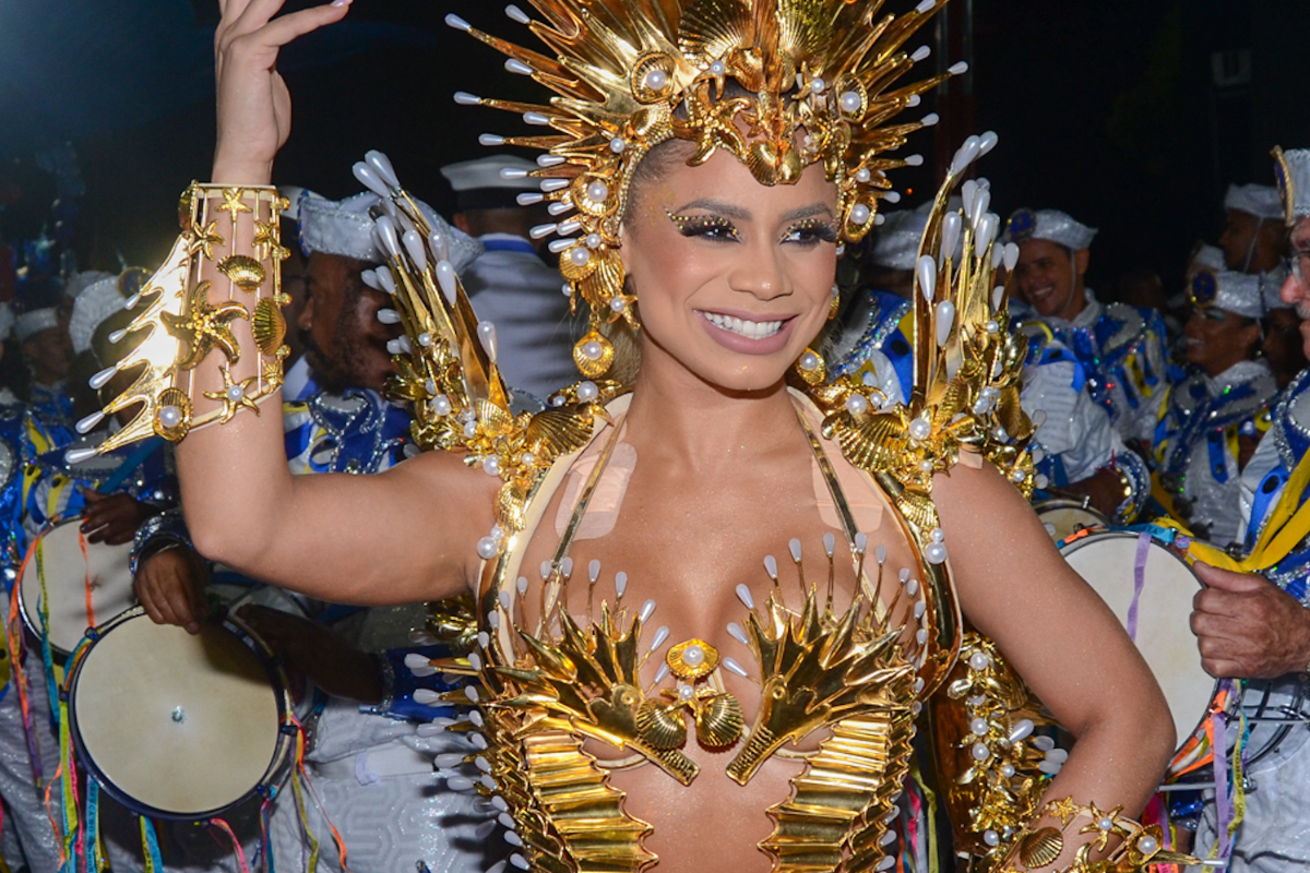 Vestida de sereia dourada, a Mulher de MC Guimê desfilo pelo terceiro ao consecutivo na agremiação, com muito samba o pé. “Vou mostrar o poder da sereia na Sapucaí!”, disse ela.