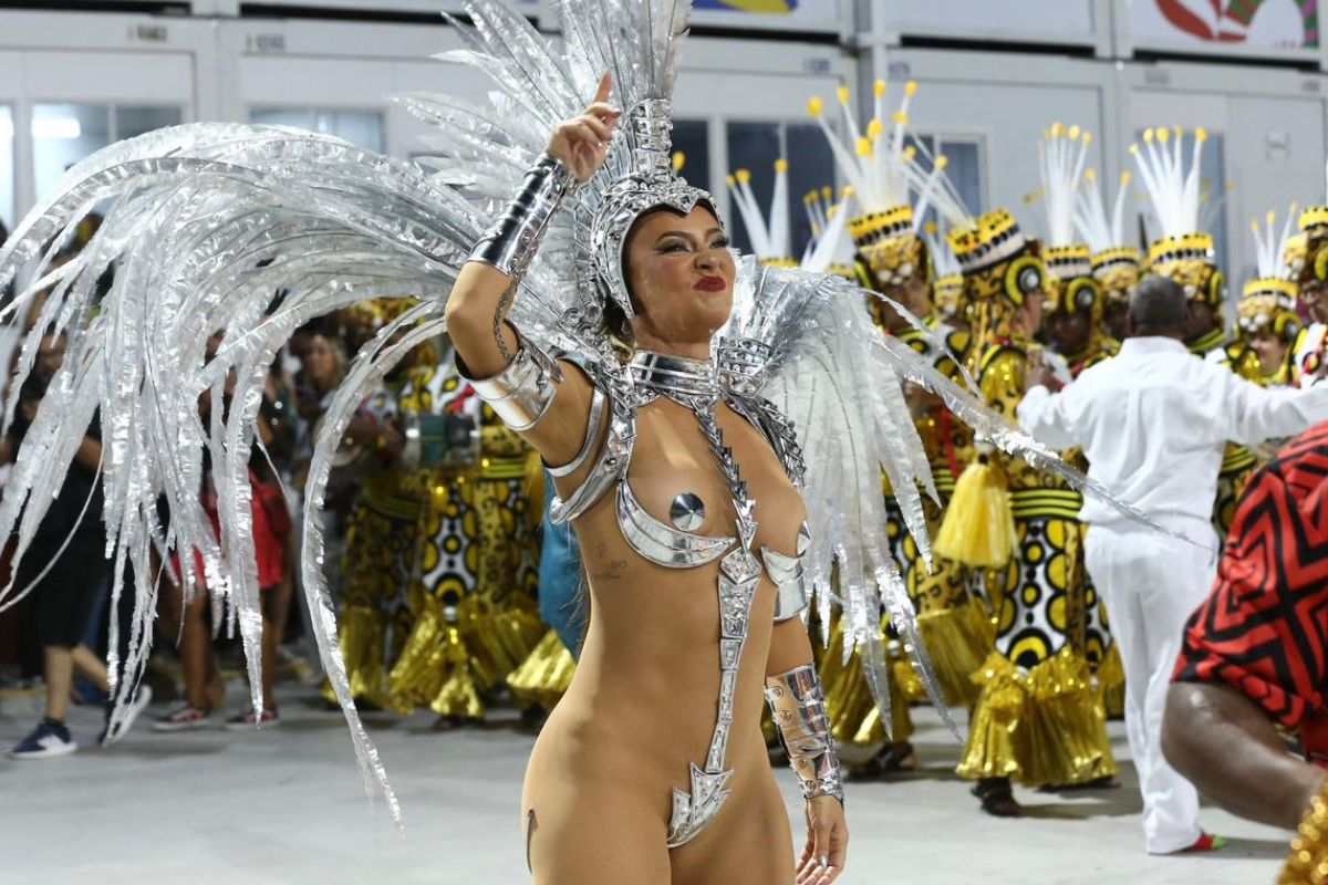 A Grande Rio fez um enredo homenageando Zeca Pagodinho e Paolla Oliveira veio vestida de metais de Ogum, uma referência ao protetor do sambista.