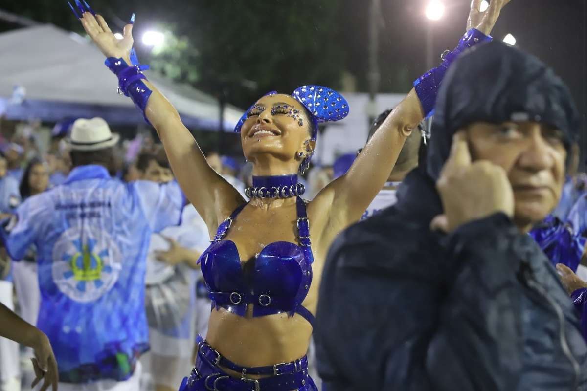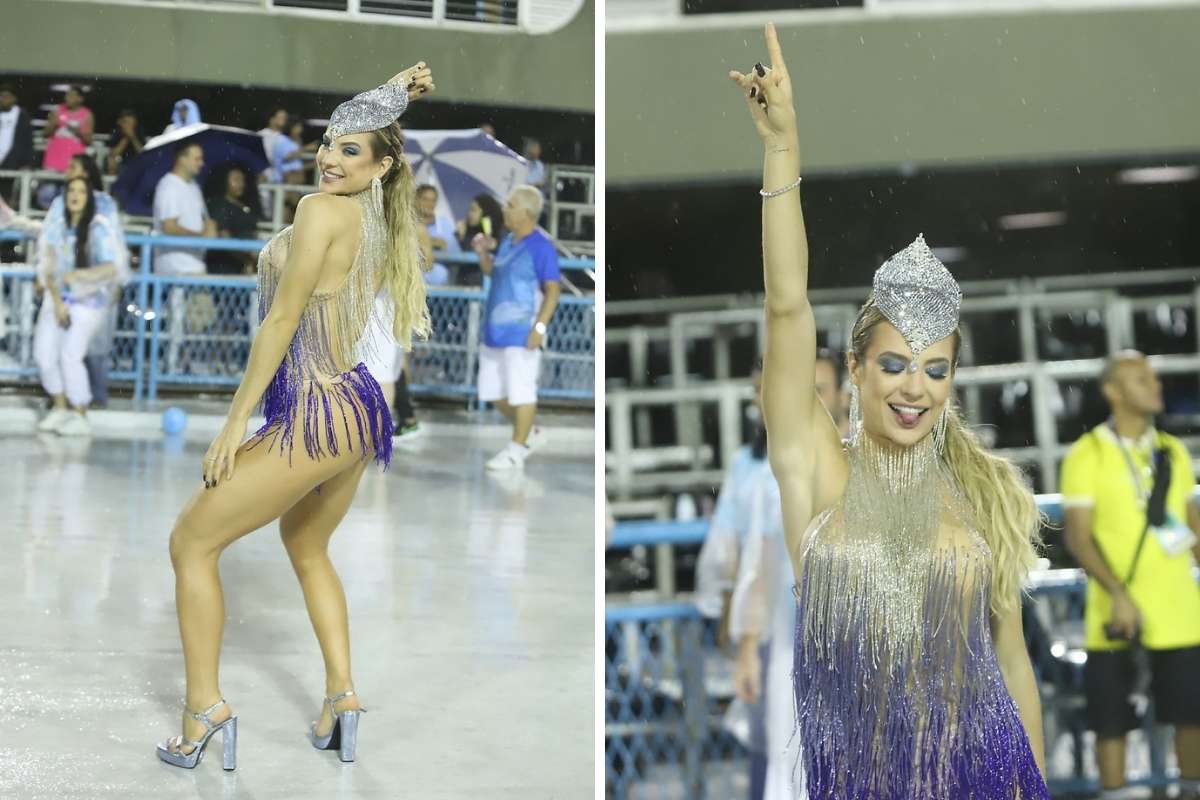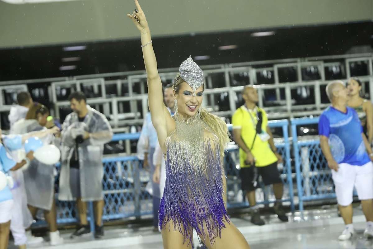 Sabrina Sato cai no samba debaixo de fortes chuvas na Sapucaí