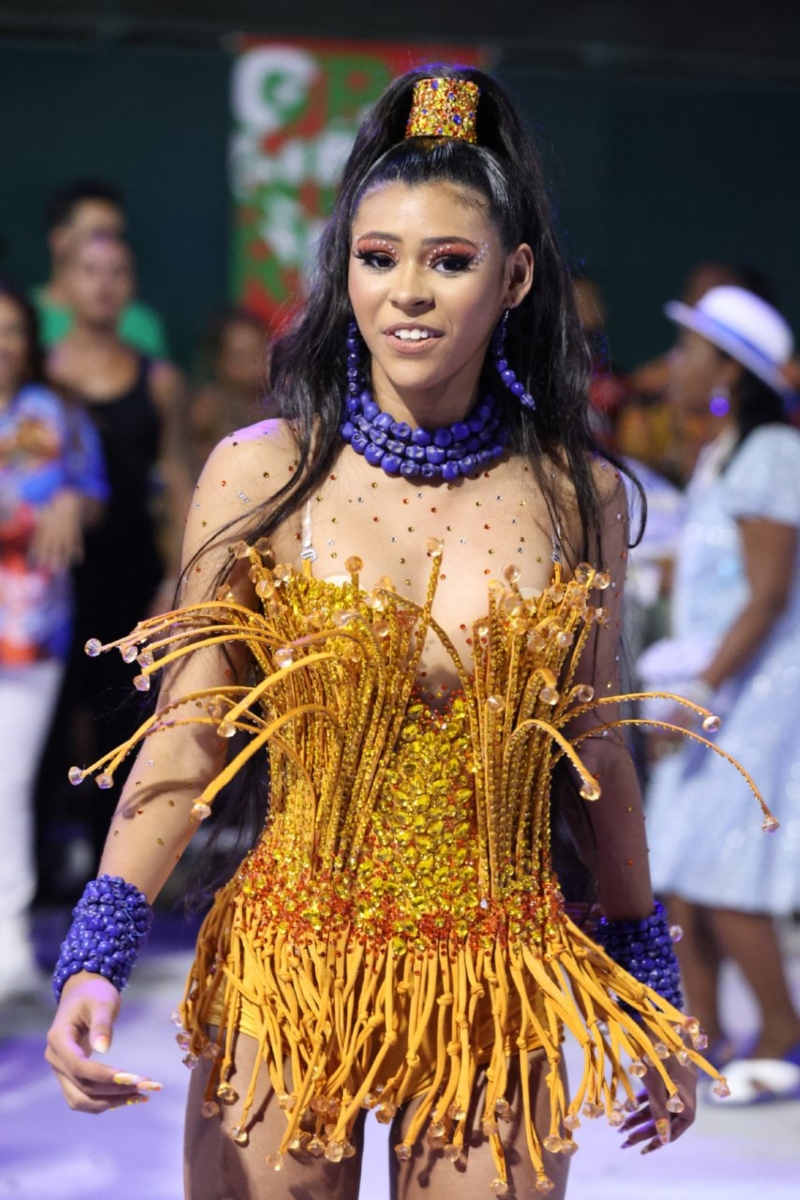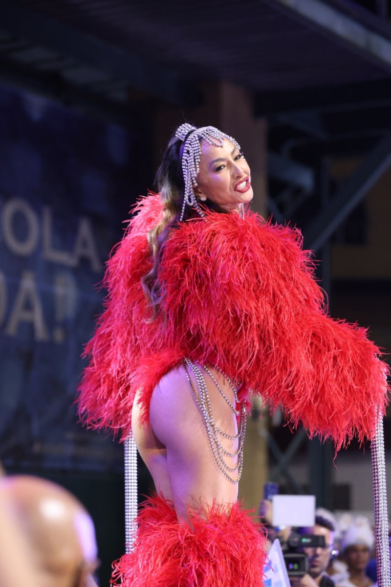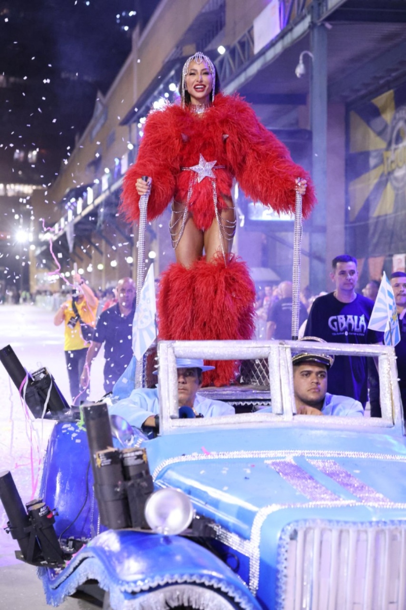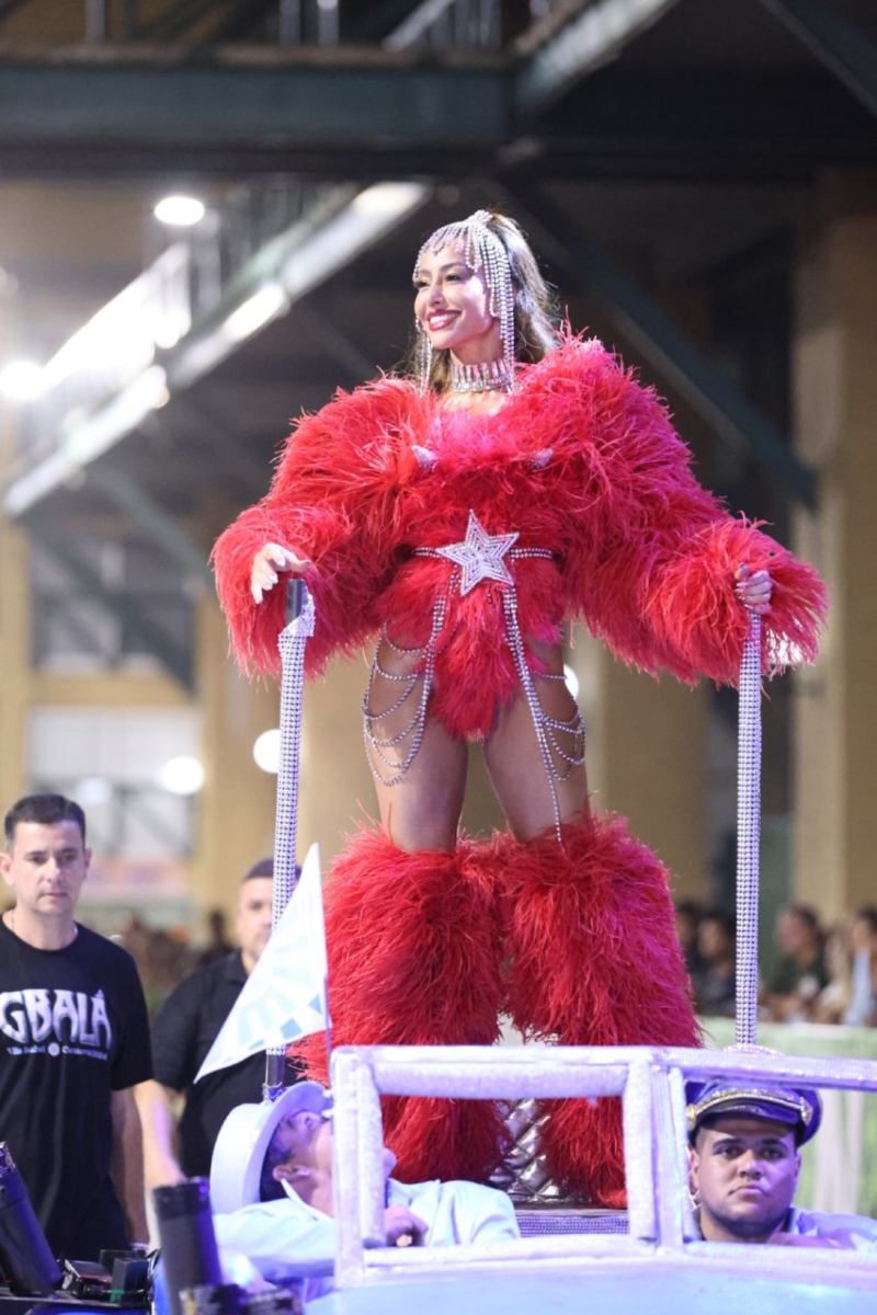 A rainha da bateria da Unidos de Vila Isabel, escola de samba que tem entre as usas a ex-BBB e cantora Gabi Martins, usou um look estilizado de Mamãe Noel e chegou ao desfile no alto de um carro antigo.