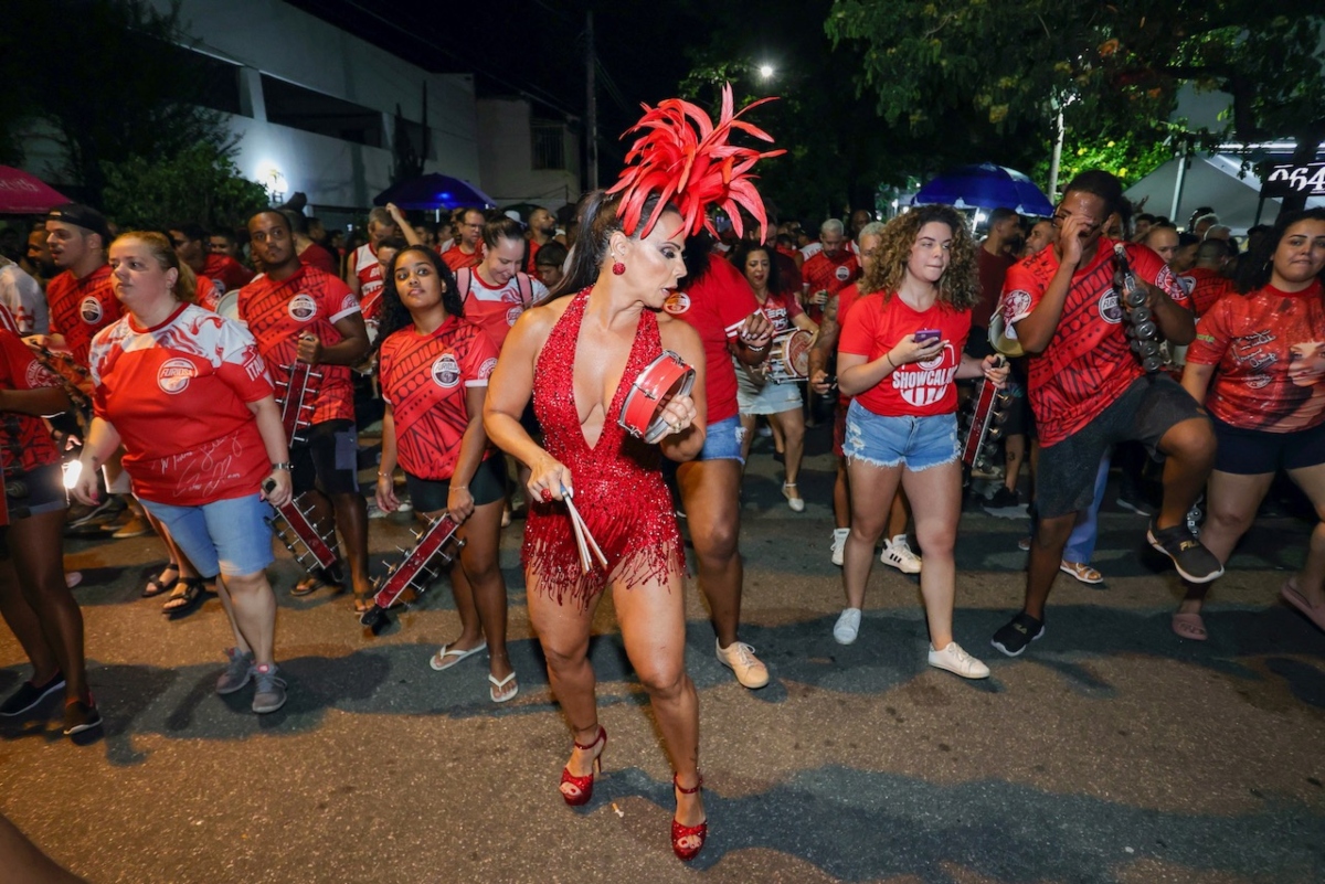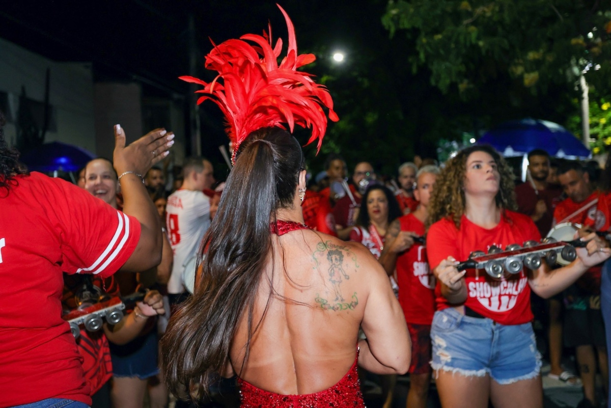 Sempre muito dedicada, a artista de 48 anos mostrou que “nasceu pronta” e, com samba no pé e na ponta da língua, exaltou seu amor pela agremiação ao longo do ensaio.
