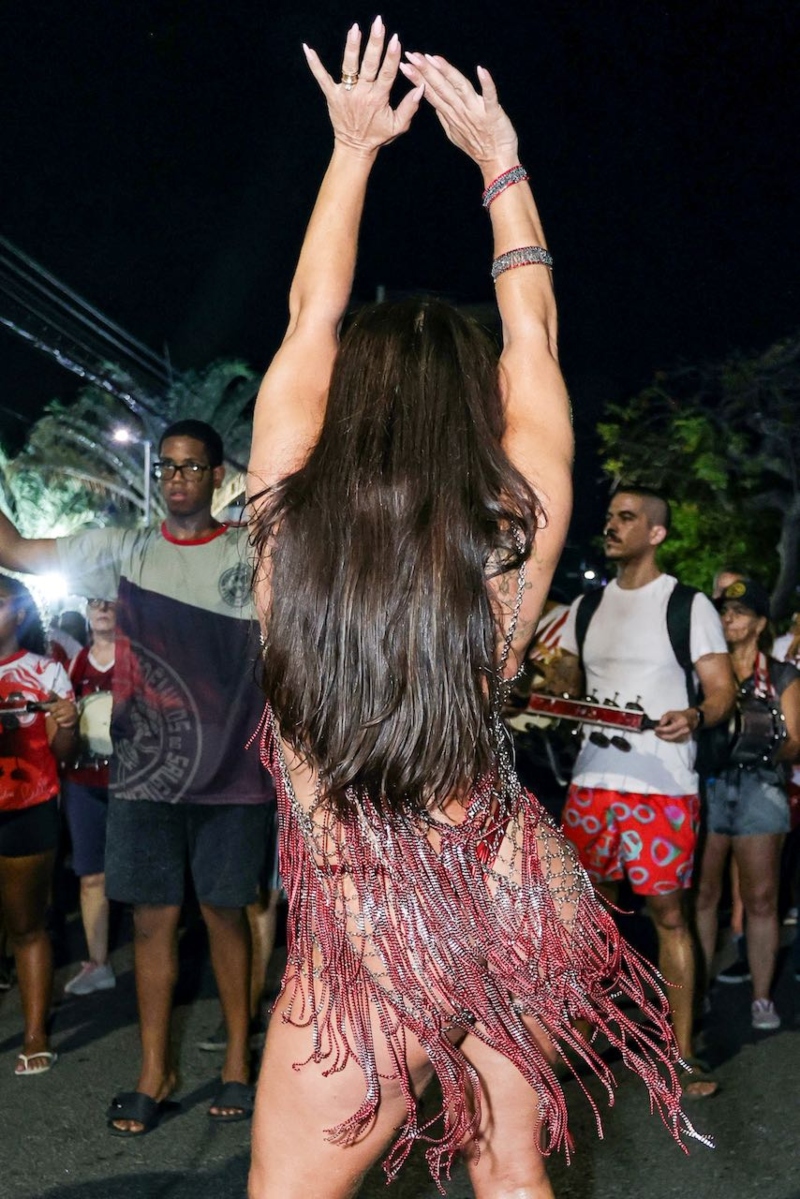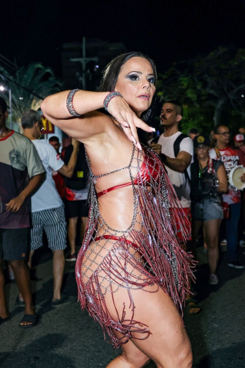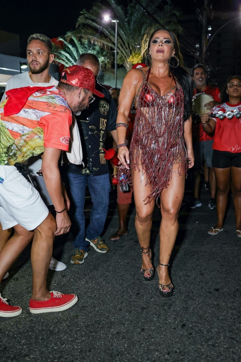 Mas o samba rolou solto na “despedida”, com a onipresente rainha de bateria da vermelho e branco. Exuberante, Viviane Araújo despontou com um biquíni vermelho metálico, coberto por um vestido de franjas no mesmo tom, que evidenciava sua forma física.