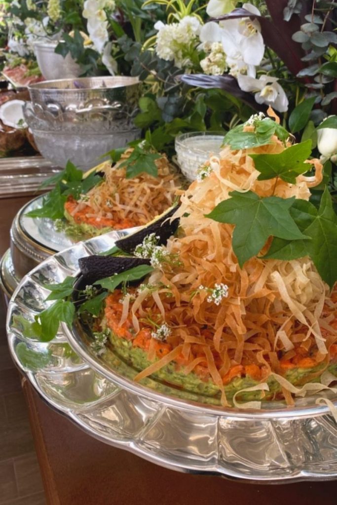 O menu em geral contava com uma estação gastronômica composta por saladas, vegetais e itens veganos, pensando na alimentação seguida por Sasha e demais convidados que também são adeptos ao veganismo.