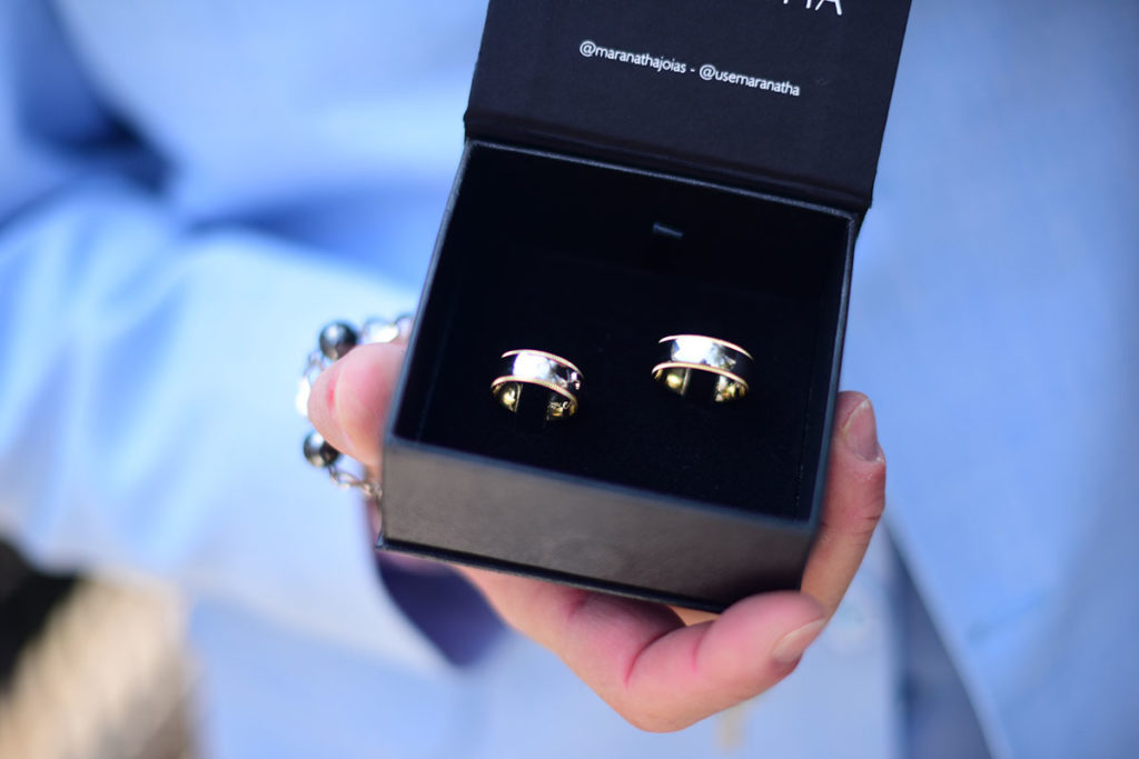 O moço, sempre sensível, não se conteve e foi às lágrimas na hora da cerimônia. Ele exibiu orgulhoso as alianças que ele e Day escolheram, confeccionadas pela Maranatha Joias.