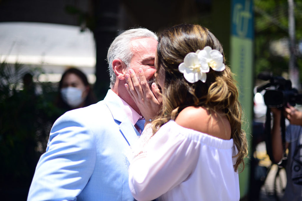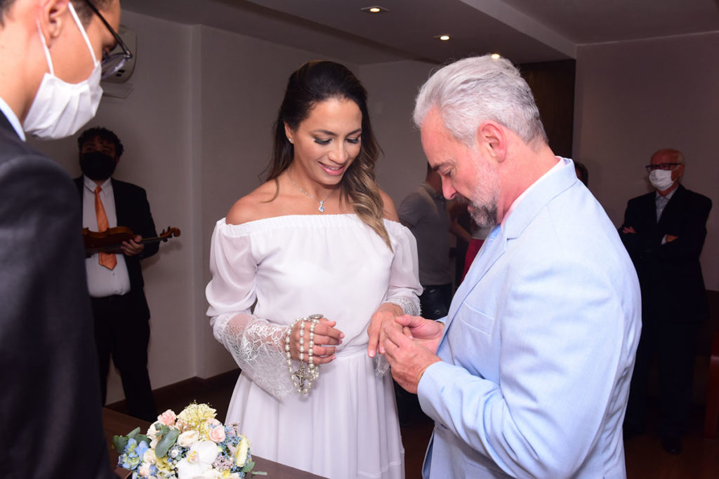 “Ia ser uma cerimônia só no cartório, mas virou um evento! As pessoas ofereceram algumas coisas como presentes e decidimos fazer um almoço para a família. Ganhamos o espaço (Espaço Horta) a Maranatha Joias fez as alianças do jeito que a gente queria e estou mostrando elas em primeira mão para você e para os leitores do OFuxico! É feita em ouro branco e ouro amarelo, com brilhante, além de um solitário lindo pra ela usar com a aliança.”