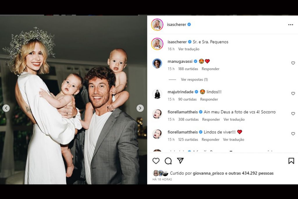 Em sua conta no Instagram, Isa compartilhou diversas fotos com o marido. Em uma das imagens, eles aparecem com os filhos gêmeos Mel e Bento, de oito meses.