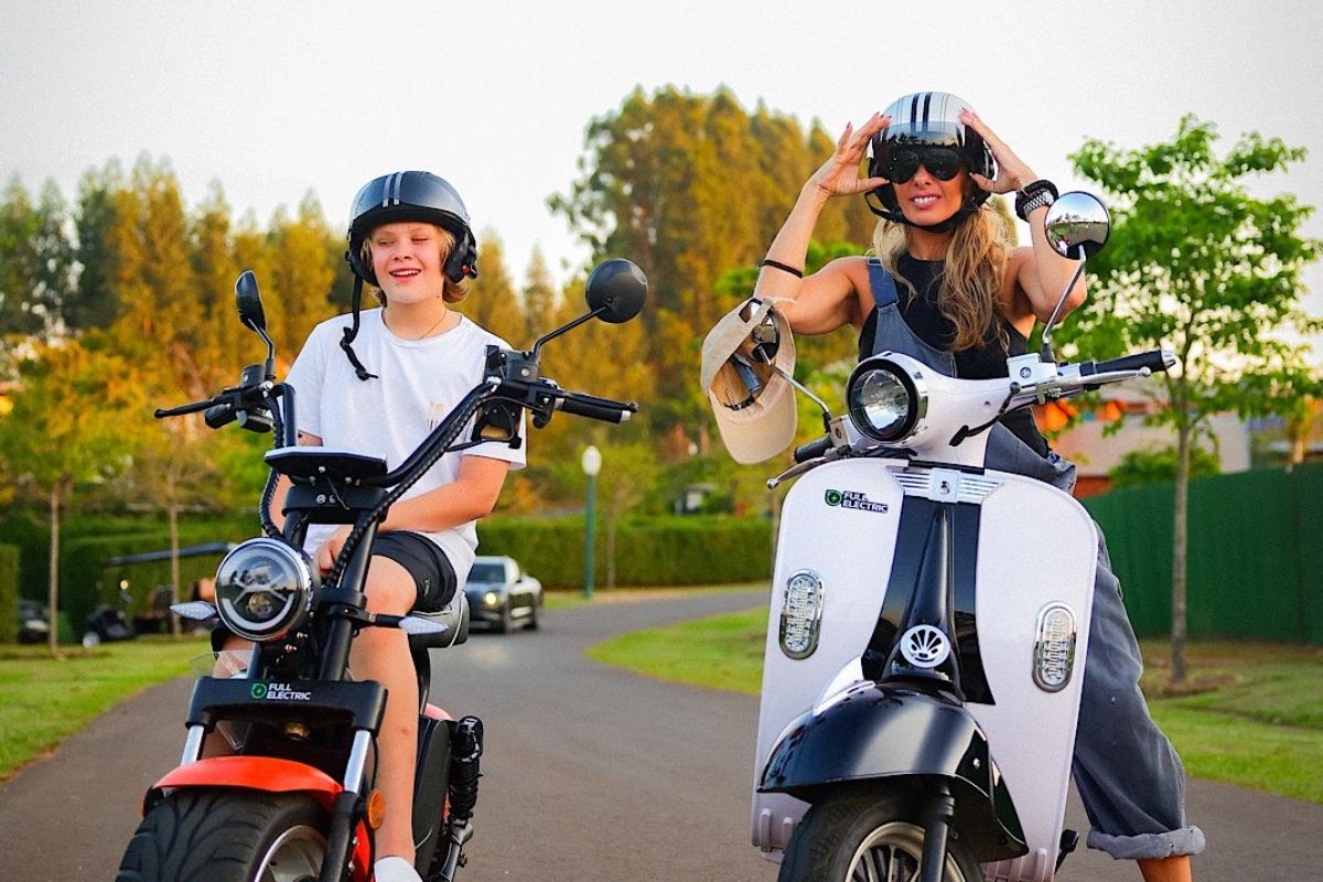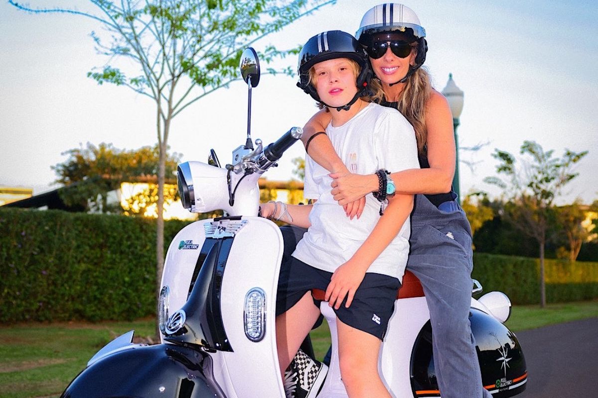 Cada um na sua ‘motoca’, Adriane em uma branca e o pequeno em uma vermelha, a dupla saiu pelas ruas calmas do local, devidamente protegidos com capacete, e se divertiram em um momento ‘mãe e filho’.