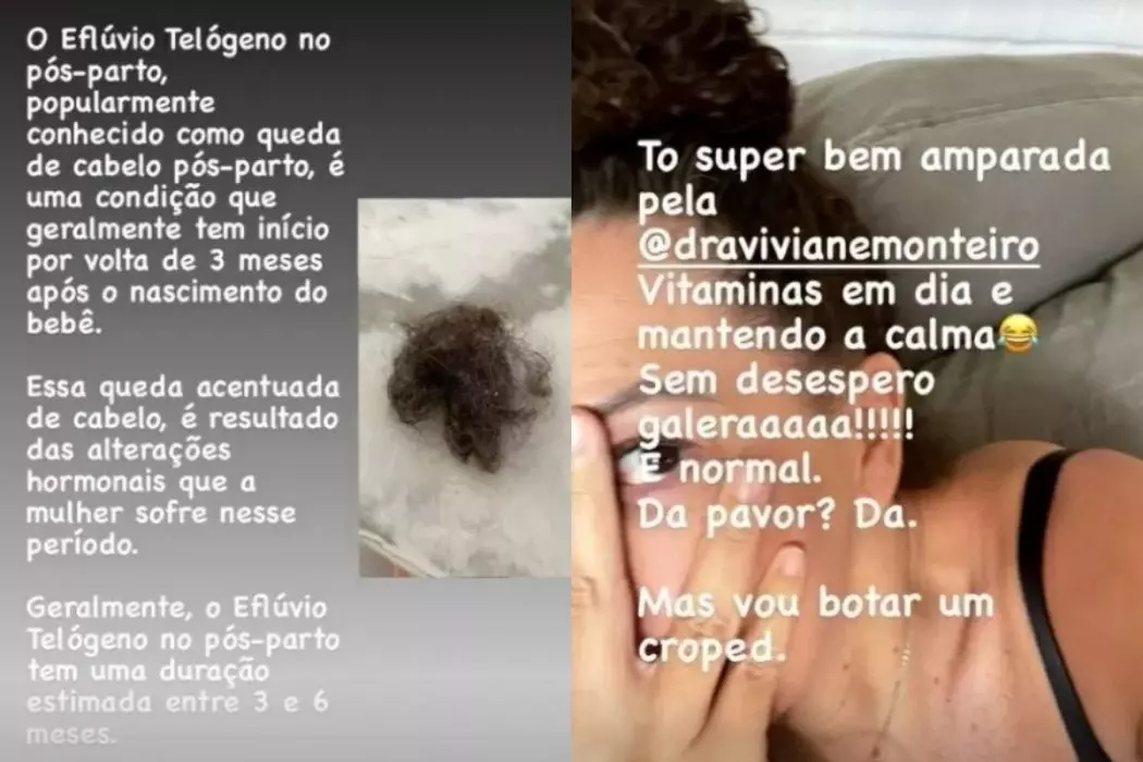 “Eflúvio telógeno pós-parto. Começa em torno do terceiro mês e vai até o sexto mês de pós-parto. Já ouviu falar?”, questionou a atriz nos stories.