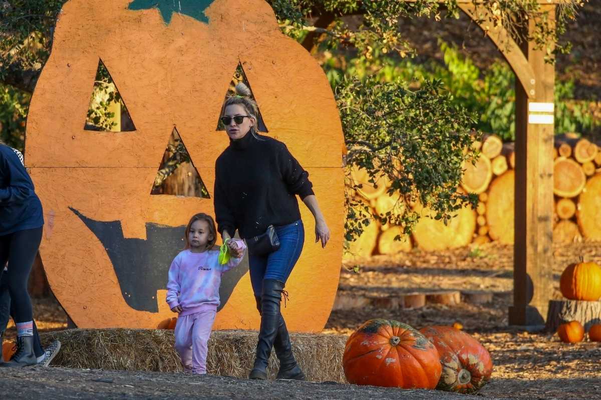 Kate Hudson visita plantação de abóboras ao lado de filha e noivo