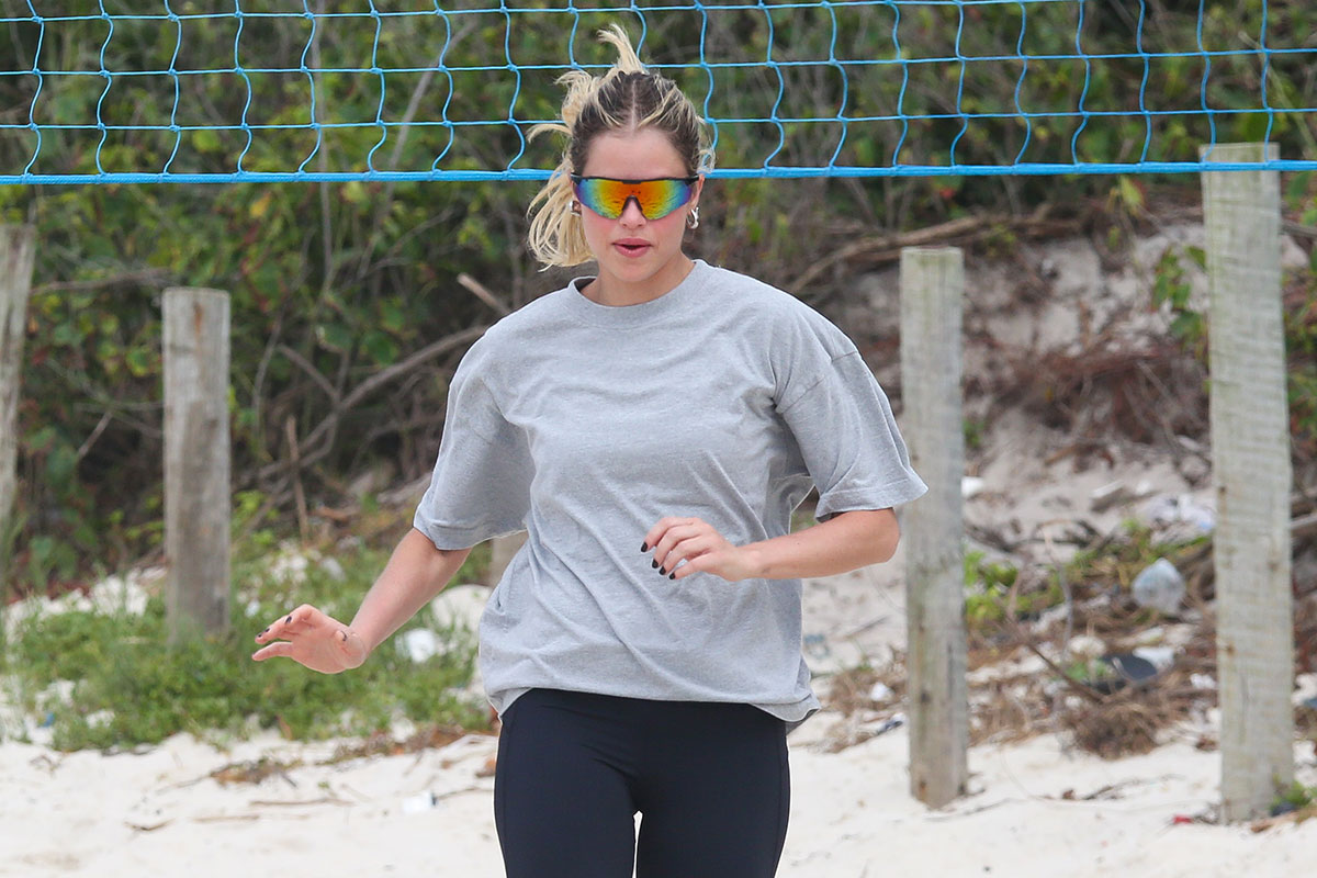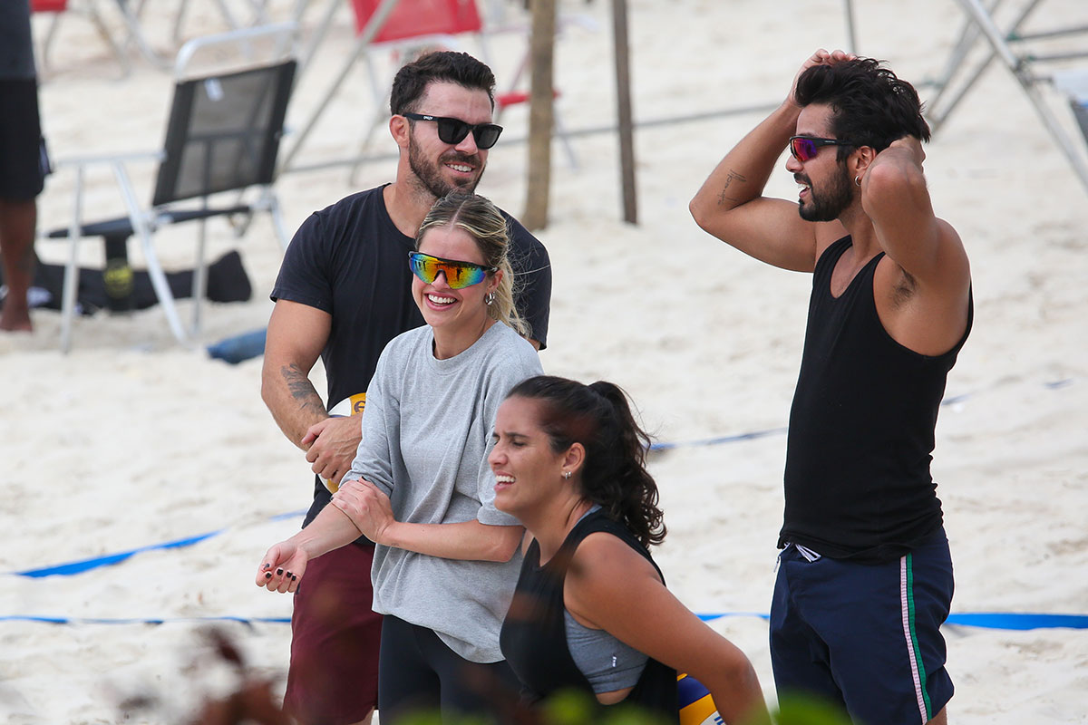 Usando um biquíni preto, a atriz esbanjou sua boa forma e se deliciou com um banho de mar ao lado do amado. O casal também se exercitou com uma partida de vôlei.