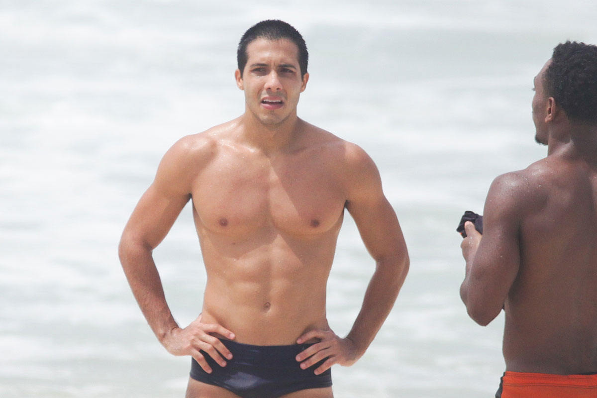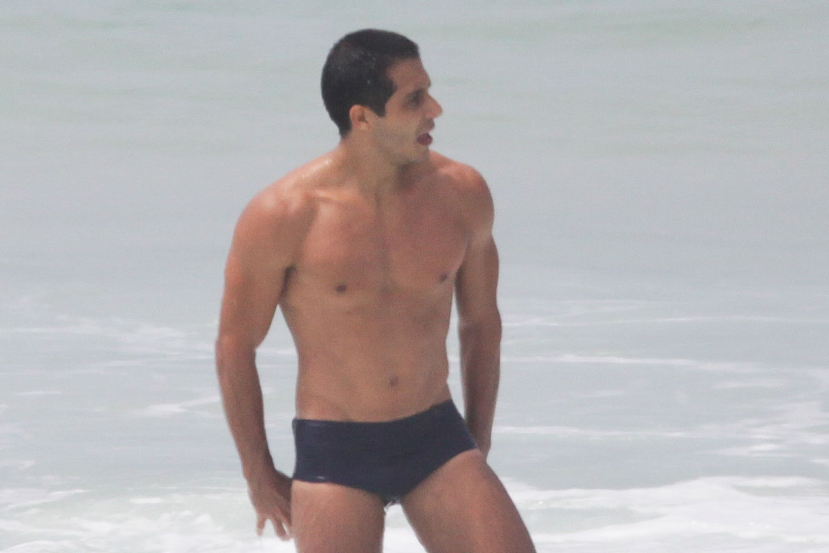 Rafael Gualandi, o Enzo da trama, também marcou presença na praia para curtir um banho de mar e mostrou seu corpão ao surgir apenas de sunga.