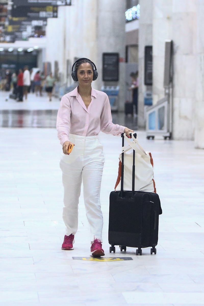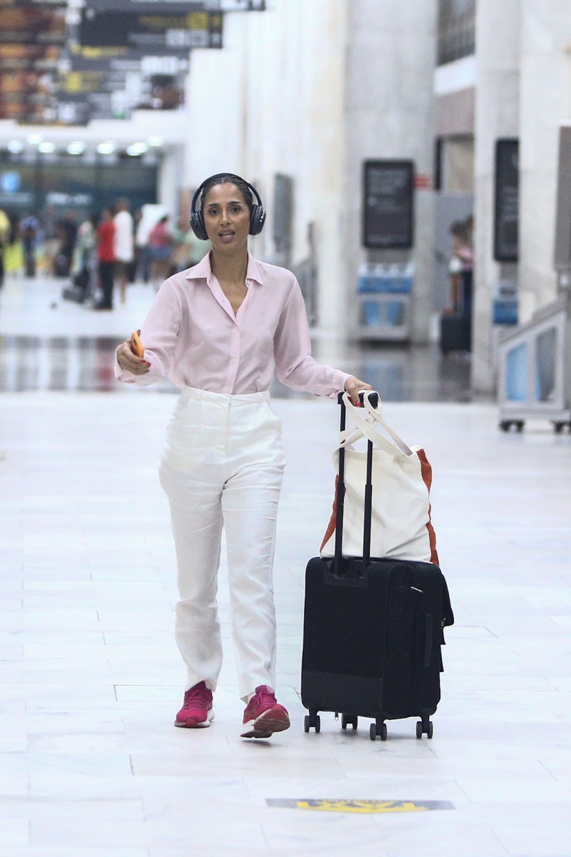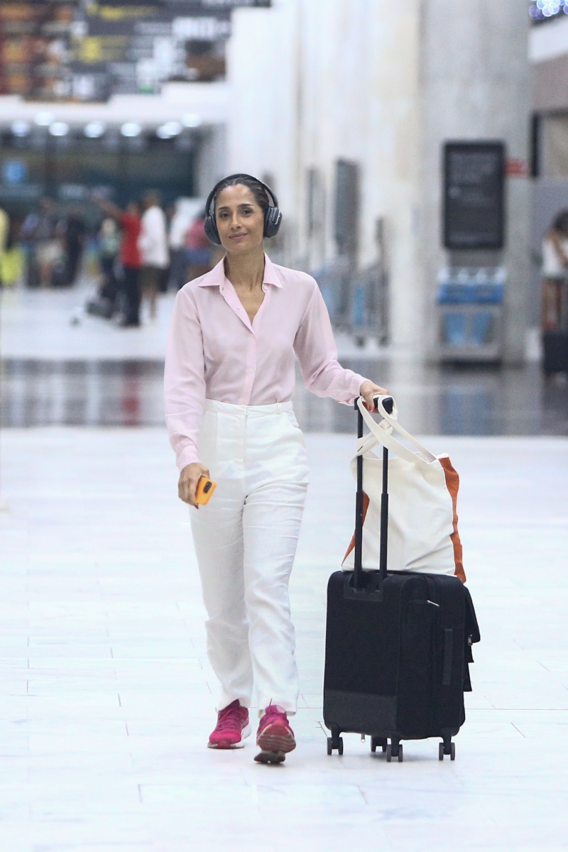 Camila Pitanga ‘esquece Bebel’ e usa look comportado em aeroporto