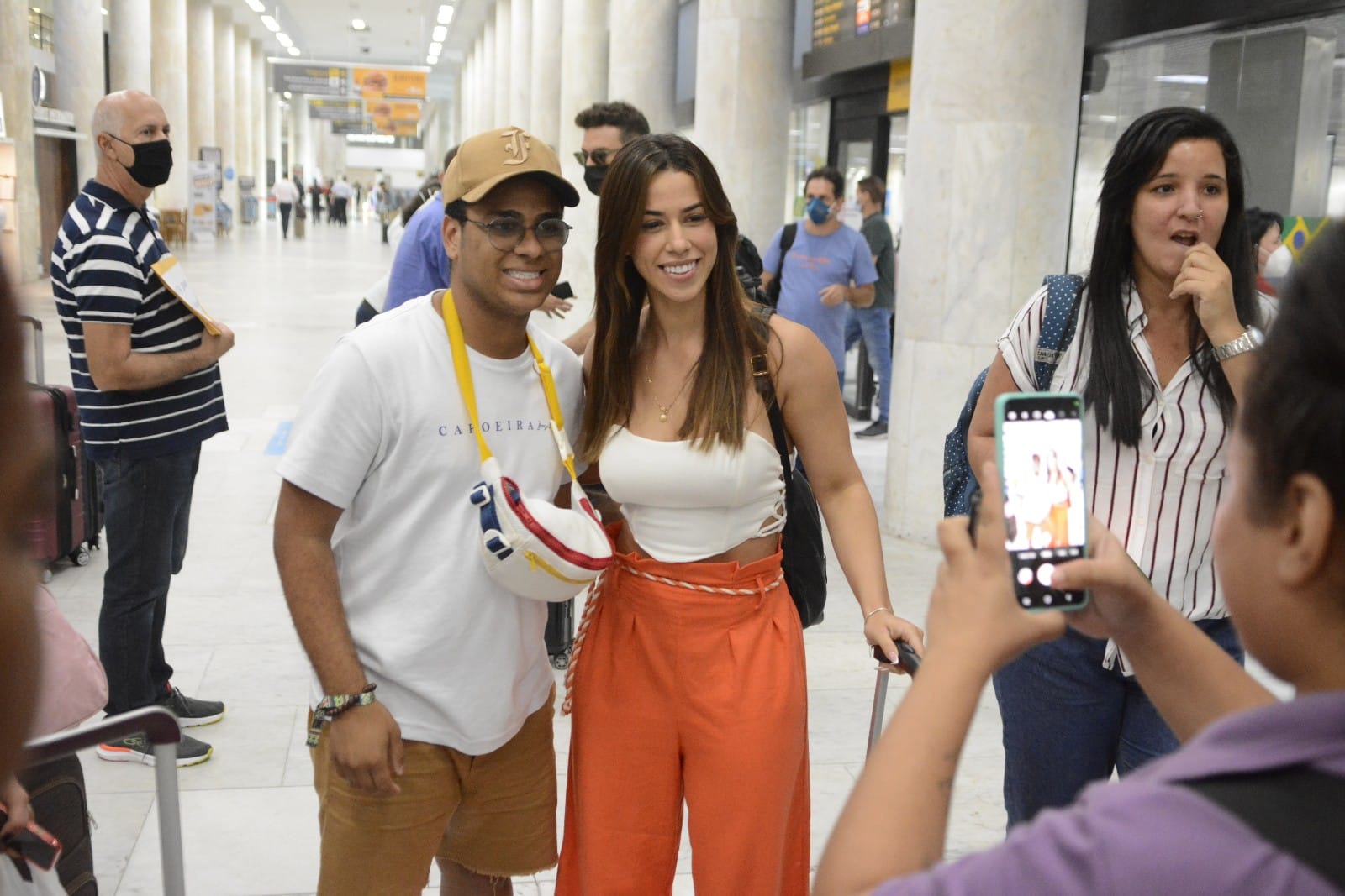 Para a viagem, a ex-sister optou por uma calça laranja bem chamativa, para retornar para a casa daquele jeito, e um cropped branco para compor o look, além, é claro, da mala com os seus pertences pessoais.