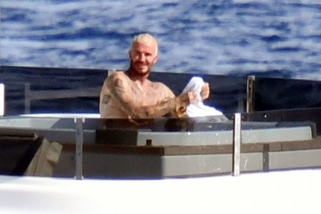 David Beckham mostra sua nova tatuagem e cabelo descolorido durante passeio de iate na Ilha de Capri