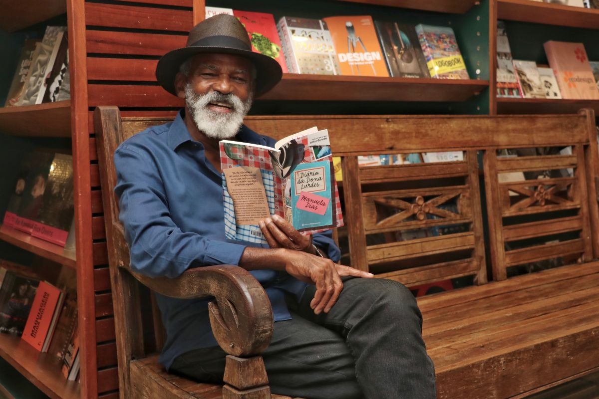 Antônio Pitanga sentado no banco, lendo o lançamento Diário de Dona Lurdes – Foto: Wando Silva Brazil News