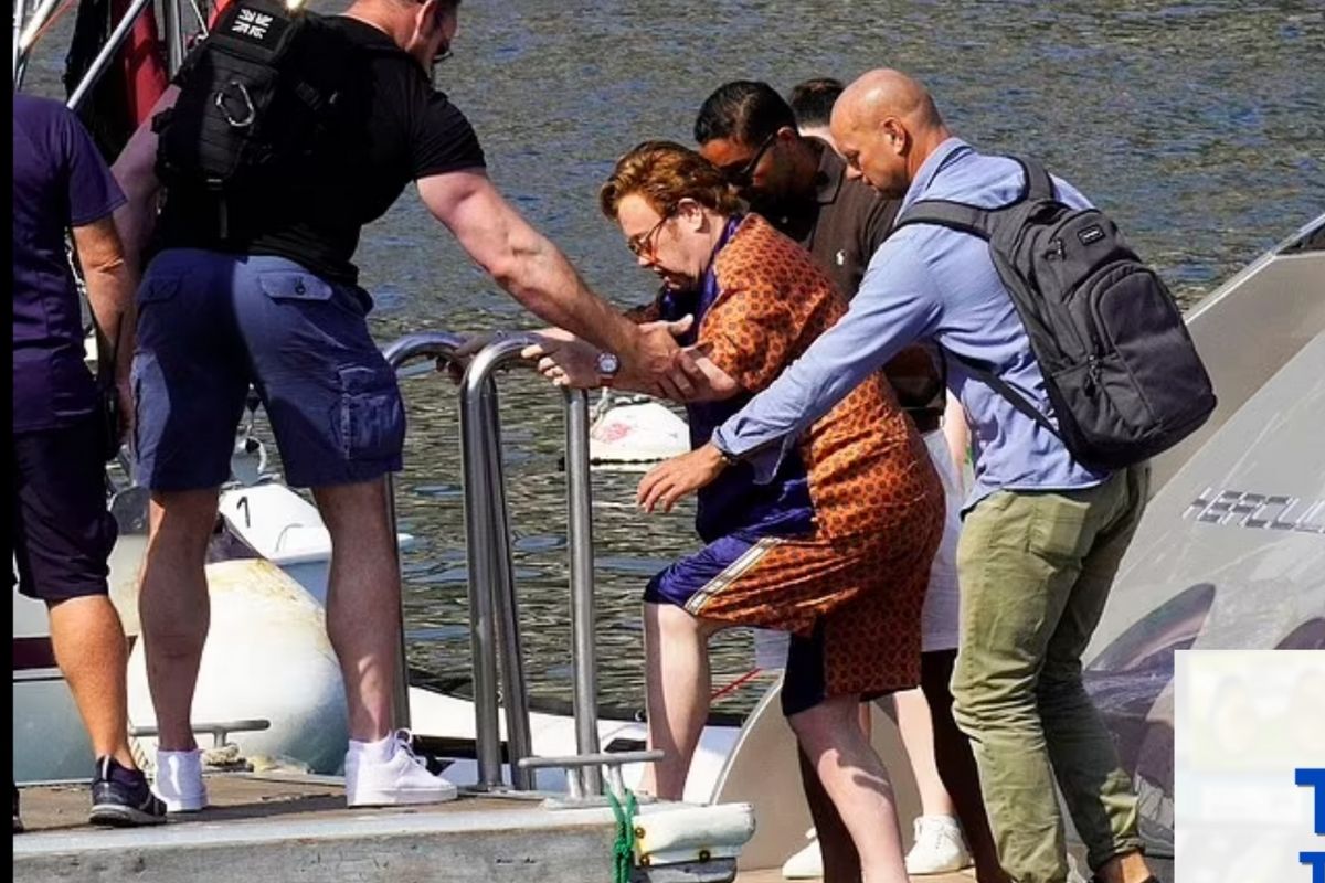 Elton John cercado por ajudantes na hora de desembarcar Grosby Group