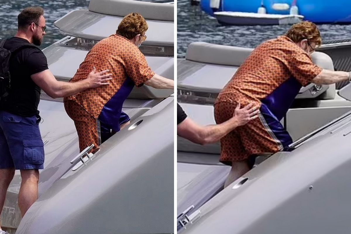 Elton John estreia novo tom de cabelo ruivo durante passeio de iate pelo mediterrâneo