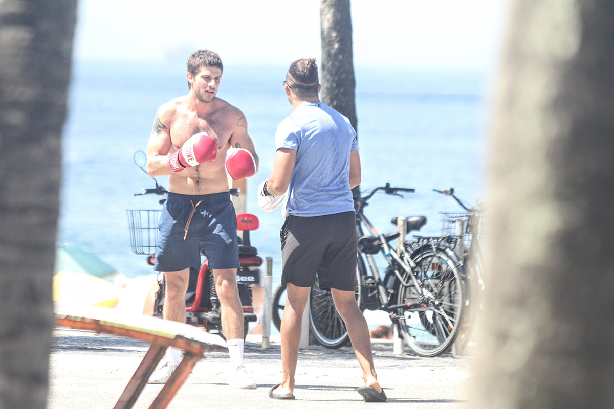 O ator treinou boxe em Ipanema, no Rio de Janeiro, usando apenas uma bermuda preta e deixando sua boa forma à mostra.