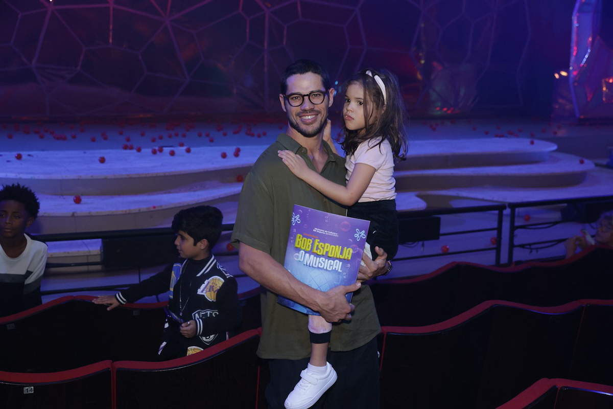 José Loreto leva a filha Bella para curtir musical do Bob Esponja