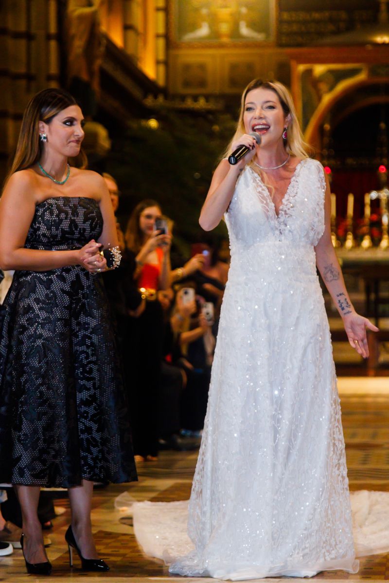 Em um cenário lindo, a estilista realizou ajustes, colocou bordados, arrumou a cauda rendada e demais acertos ali, ao vivo, na frente dos convidados do evento. depois de desfilar o modelo delicado e lindo, todo branco, Luiza Possi apresentou um pocket show para os presentes, unindo moda e música de forma bem diferente e cheia de estilo.
