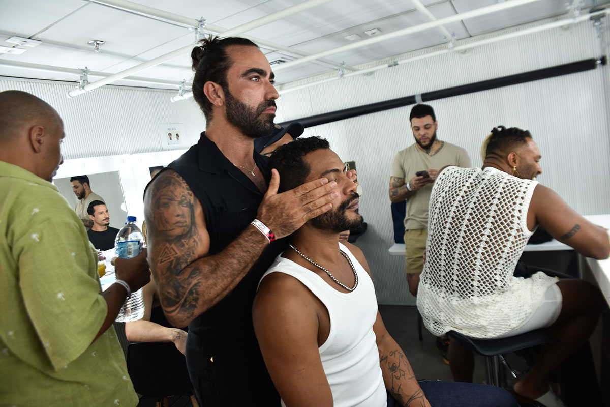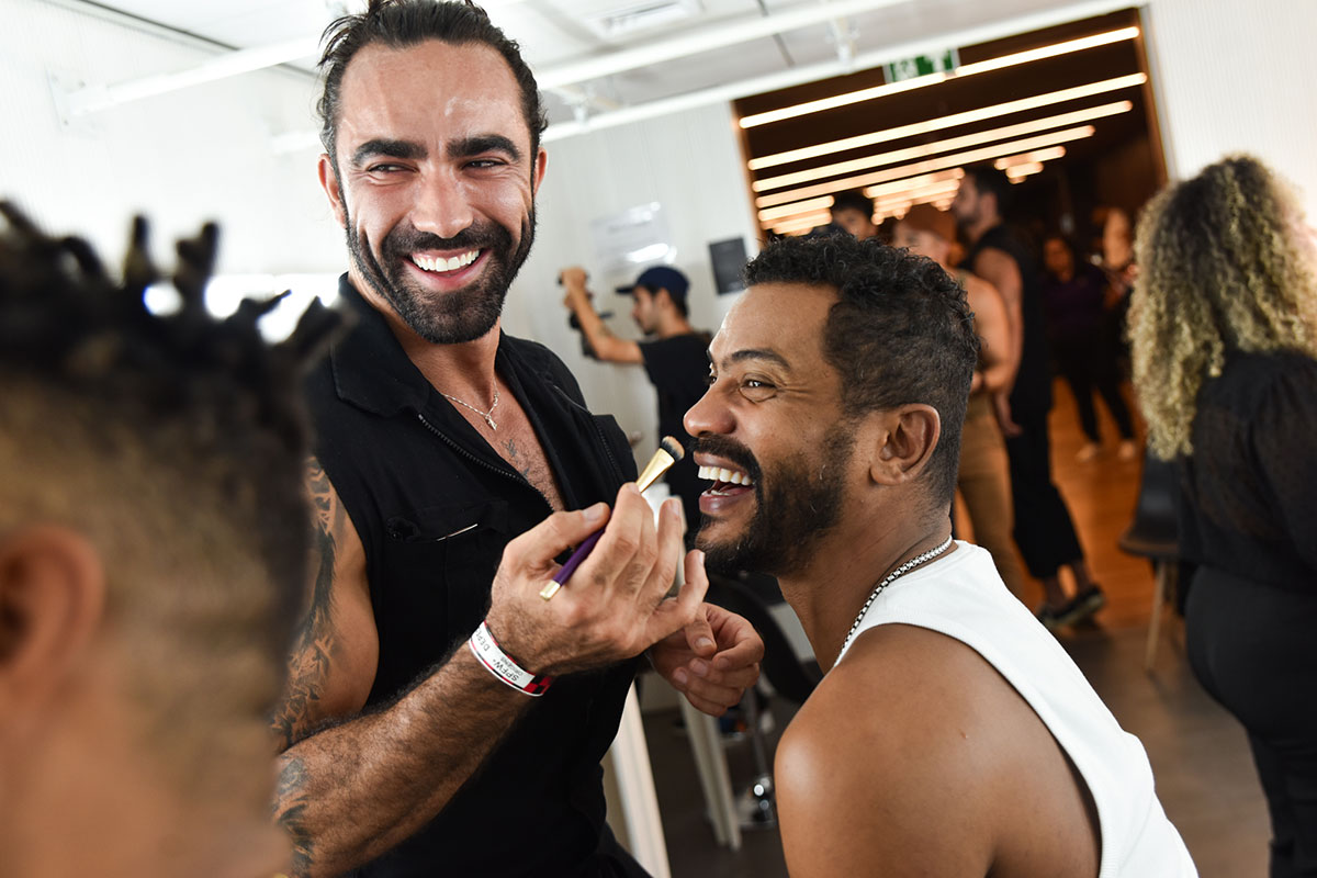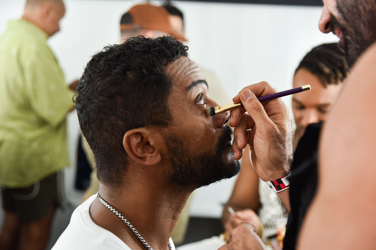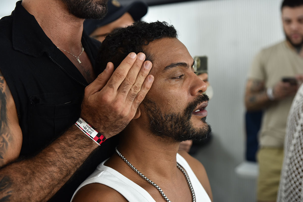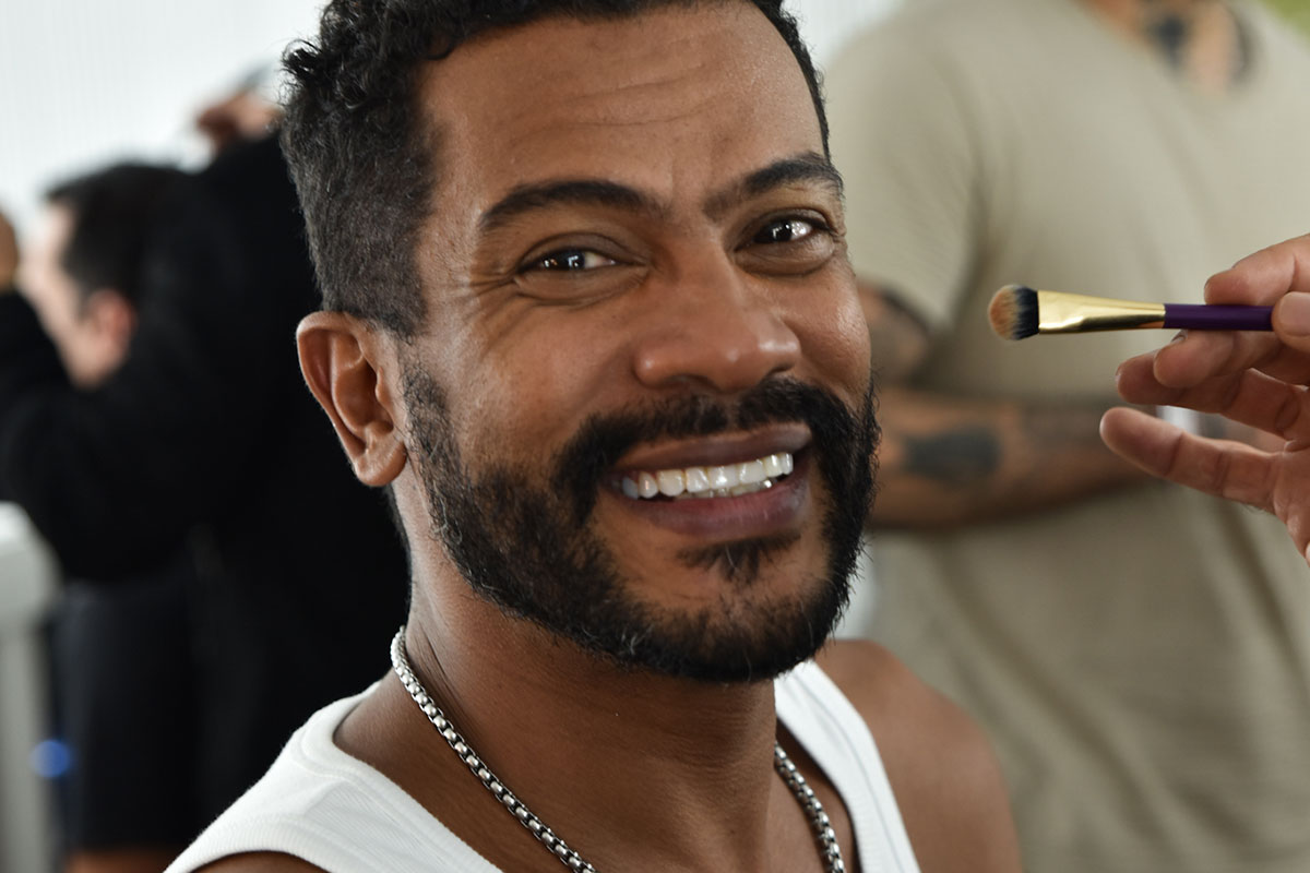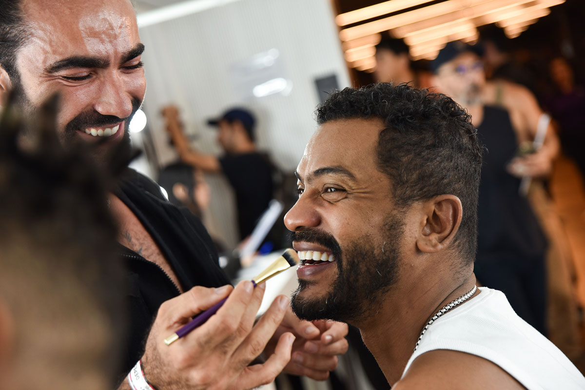 Samuel de Assis recebe massagem facial antes de desfilar na SPFW