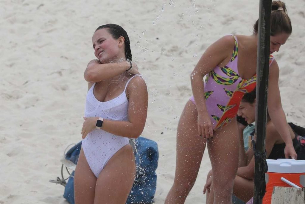 Aproveitando um dia mais ensolarado e de clima mais quente no Rio de Janeiro, a atriz foi clicada na praia da Barra da Tijuca, se divertindo e rindo bastante ao lado de alguns amigos.