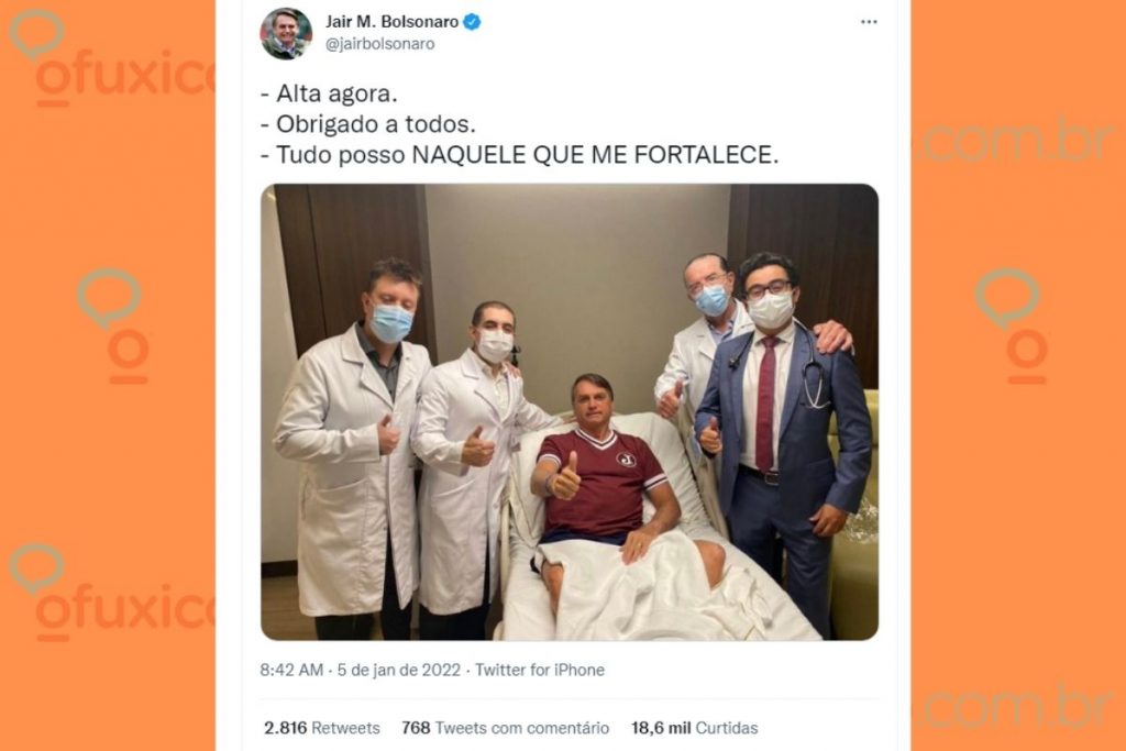 Na manhã desta quarta-feira, 5 de janeiro, o Presidente Jair Bolsonaro anunciou sua alta hospitalar depois de dois dias internado Hospital Nova Star, na Zona Sul de São Paulo. Ele deu entrada no local na madrugada de segunda-feira, 3 de janeiro, devido a uma obstrução intestinal.